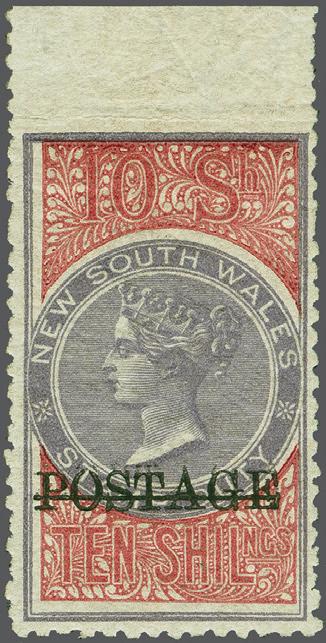 1903 (Oct): Postage Due Numeral 10 s. dull green, wmk. Crown over NSW, perf. 11, an unused example of fine fresh colour, well centred for this stamp, large part og. Very scarce Gi = £ 2'000 / BW D44 = $ 3'500.