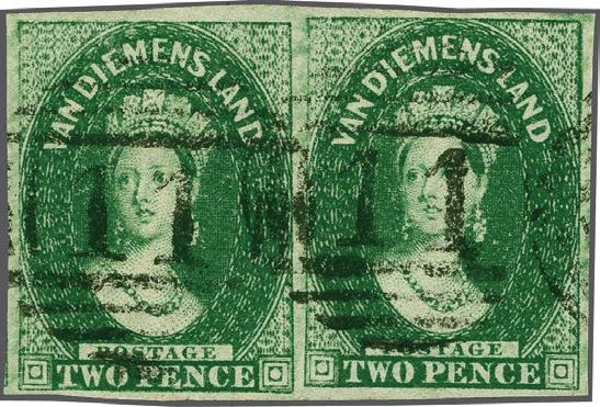 1 d. carmine-rose, Plate I, two single examples, with just shaved to good margins, positions 3 with small fault at base and 21, tied to 1850 OHMS printed cover from Sydney to the Police Magistrate in Brisbane tied by barred obliterators in black. Manuscript 'Judicial Proceedings' and 'from Solicitors Office, Sydney 22 June 1850' at left, the printed conents mentioning an affidavit to be signed and returned. The reverse with circular "SYDNEY / ♚ / NEW SOUTH WALES" despatch cds (June 22) and fair only "BRISBANE / ♚ / NEW S. WALES" arrival (July 7). Despite the imperfection a most appealing and rare entire. Provenance: Collection George Boucher, London, 19 April 1972, lot 517.