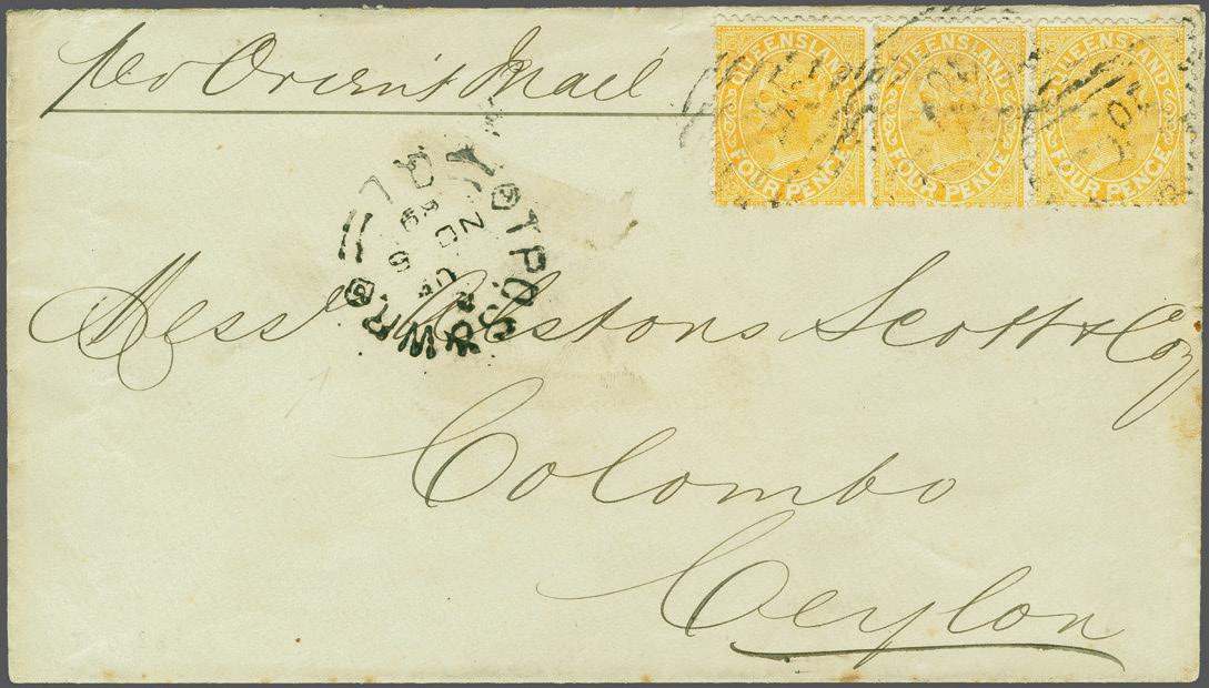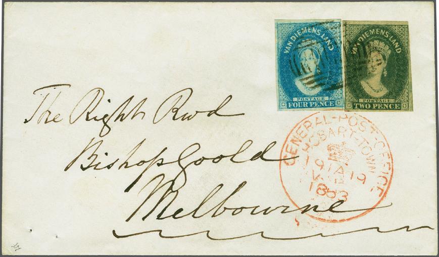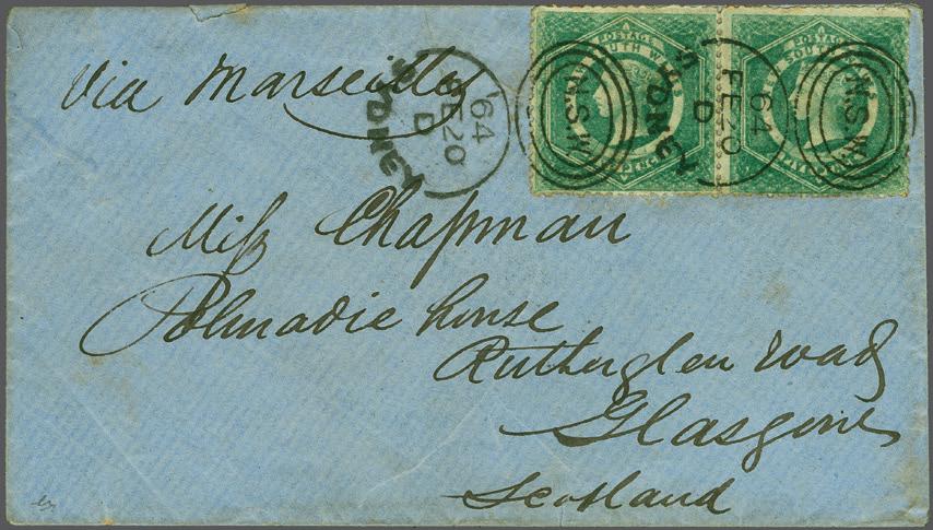 6 250 (€ 260) 1856 (Oct 25): Stampless entire letter sent unpaid from Sydney to Rheims, USA endorsed "p. Centurion via England", with handstruck "3" NSW credit for outgoing Ship Letter and "Sydney / N.S.W." despatch on reverse (Nov 1). London transit cds in red (Feb 10, 1857) and struck with framed "GB / 1F.60c." in black. The '8' at left probably British credit (the letter actually weighs 9 grams) with '16' décimes charged on arrival in manuscript. An unusual entire.