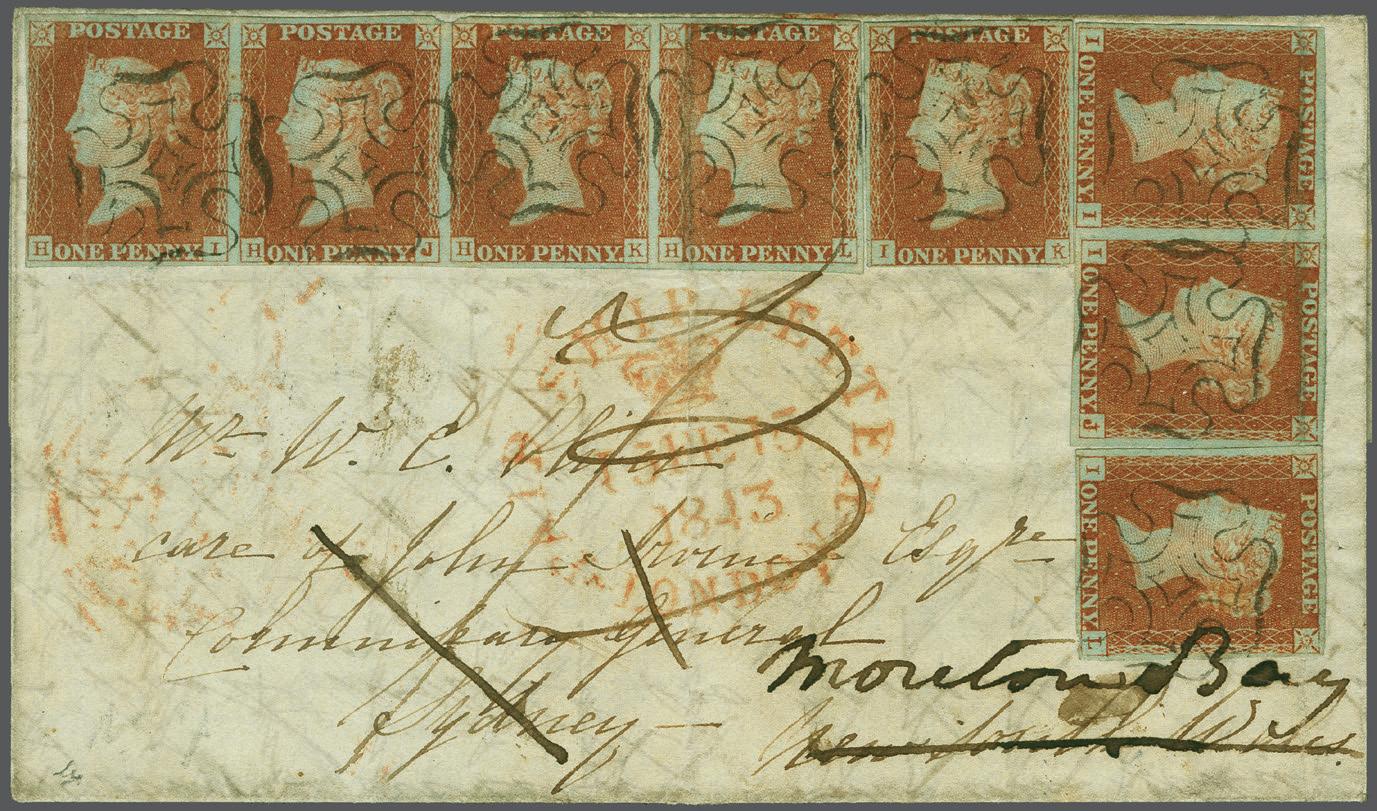 1843 (Feb 13): Second sheet of entire letter from Edinburgh to Sydney bearing 1841 1 d. red-brown imperforate, plate 25, two single examples lettered IK (double letter K) and IL, a horizontal pair lettered II-IJ and strip of four lettered HI-HL; all tied by Maltese Crosses in black, with oval "PAID SHIP LETTER / ♚ / LONDON" in red below (Feb 15). Reverse with "SHIP LETTER / ♚ / SYDNEY" in black (June 30) and redirected from Sydney to Moreton Bay, Queensland in manuscript at base with '7d.' manuscript charge (3d. + 4d. for coastal Ship rate). Minor vertical file fold and trivial imperfections to margins on the adhesives as to be expected but a most appealing and rare entire.