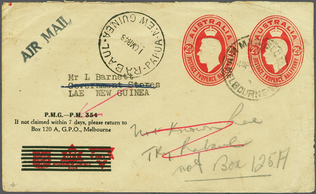 Oval 2½ d. red + 2½ d. red postal stationery envelope with "P.M.G. - P.M.354" imprint above deleted by six black bars Comforts Fund red icons, sent airmail (2 d. + 3 d. airmail) to Lae, New Guinea cancelled by 'Air Mail Service / Melbourne' cds. "LAE / PAPUA NEW GUINEA" cds on reverse with 'Not Known Lae, Try Rabaul' and "RABAUL / PAPUA NEW GUINEA" datestamp (March 10, 1948) above. Returned to Melbourne (March 16). Unlisted printed to Private Order envelope - for a similar usage see Brusden White ES87. The permit holder for No. 354 was Roy Robbins, Turf Commission Agent. Rare and very fine.