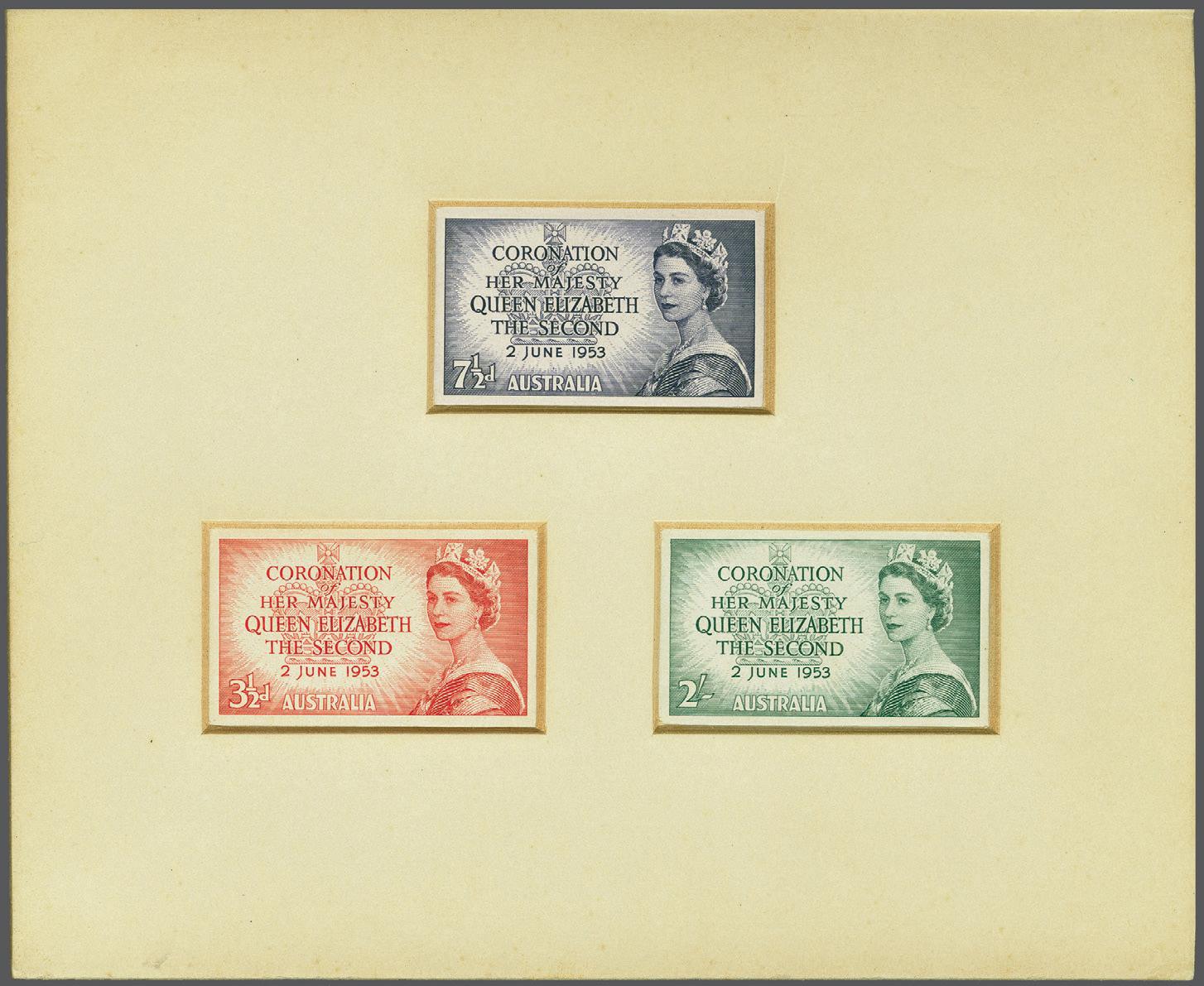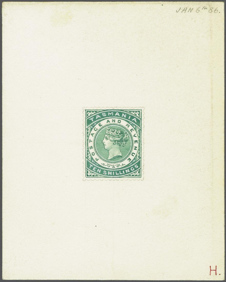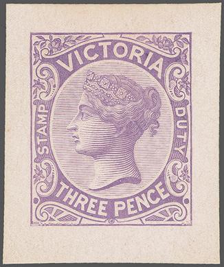 1849: Alfred Clayton 'Sydney View' Essays, composite photo-lithographic facsimile of the original Essay which is housed in the Tapling Collection in the British Library, comprising reproductions of the 1d. and 3d. Essays which are mounted on paper and endorsed "The form and colour are approved, but the execution is very far from satisfactory and must be greatly improved before the contract can be sanctioned". This facsimile was produced by Alfred van Dyck, some time before the originals were sold by him to Tapling and prior to Thomas Tapling's death in 1891. The blank space in between contained the Essay for the 2d. value which was purchased for, and remains in, the Collection of His Majesty King Charles III. We record just one other example of this reproduction (copy with the lot), ex Sir Gawaine Baillie, sold at Sotheby's, Melbourne in July 2005, lot 812, which was not as fine as the example offered here.