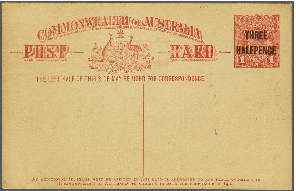 War Tax Surcharged "THREE / HALFPENCE" in black on 1 d. red postal stationery card, overprinted on residual stocks of the horseshoe AUSTRALIA card, a fresh unused example, sold together with the more common Nov 1918 issue (P48). Extremely rare with approximately a dozen examples recorded, of which just three are recorded unused Cert. RPS of Victoria (1997)