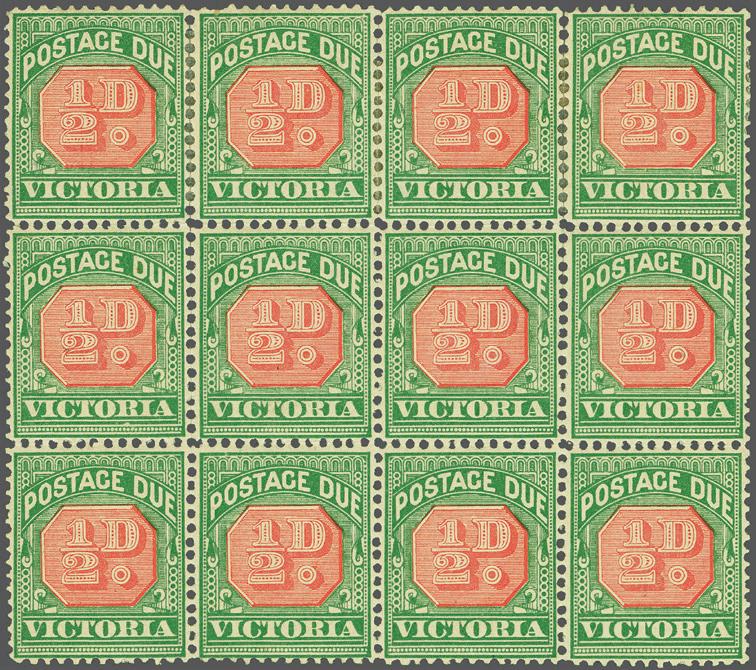 1913/23: Postage Due 2 s. rose-red & green, wmk. Crown over double lined A, thick paper, perf. 12 x 12½, a used block of twelve (3 x 4), neatly cancelled by "Registered Perth / West Australia" cds's (Oct 12, 1917). One or two perfs. blunted at top but with gum, a most attractive multiple Gi = £ 120 / BW D89 = $ 600.