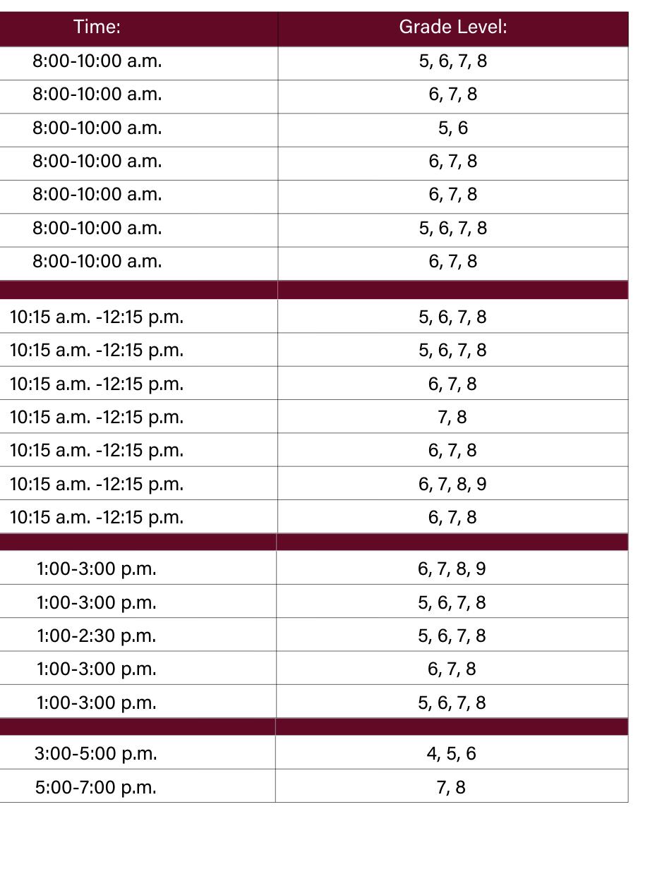 Early Bird pricing is available for registrations received by May 15, 2026. Registrations submitted after May 15,2026 will be subject to a $25 per camp price increase. ALL campers will be asked to complete a media release form and a medical and emergency release form. Each enrichment camp will have a minimum of six students, maximum of 25, unless otherwise noted. Early registration is recommended, as class sizes are limited. Parents will receive a confirmation e-mail after May 15, 2026. In the event that a class is cancelled due to insufficient enrollment, parents will be notified.