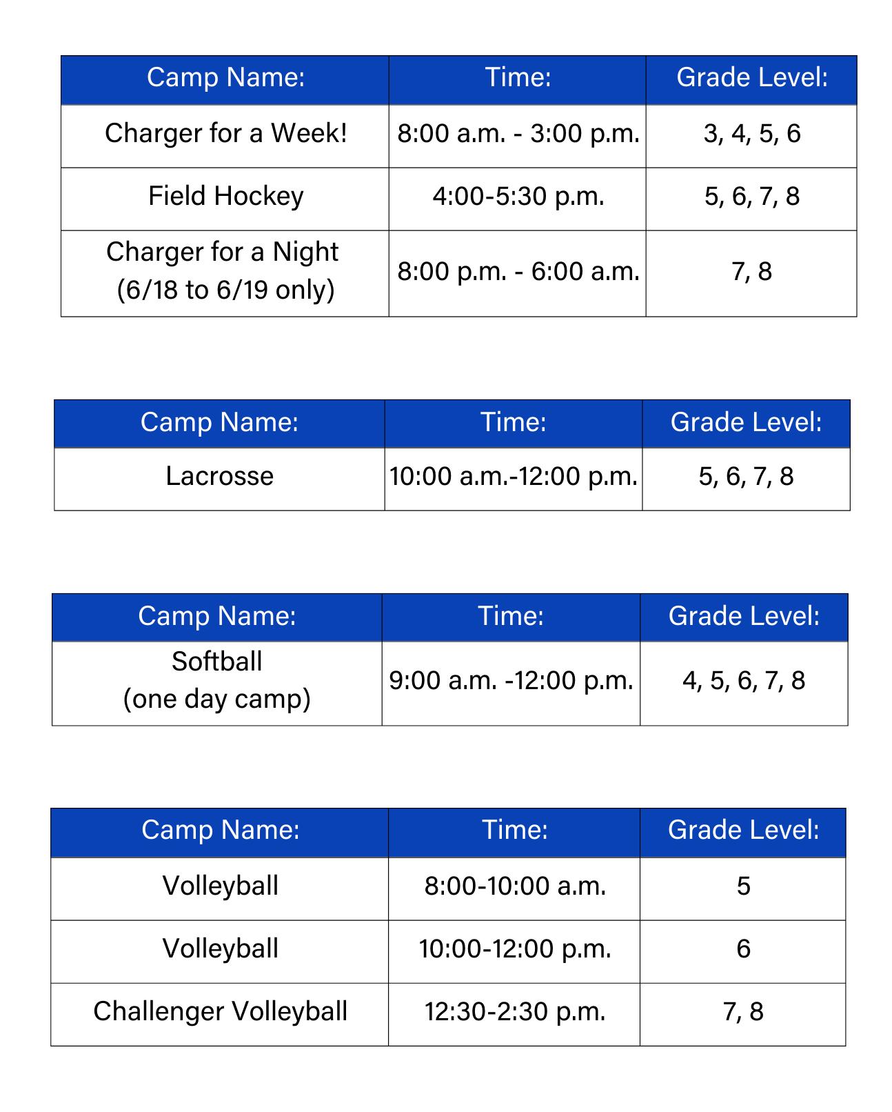 Join CJA’s “Charger for a Week” camp to experience a fullday summer camp! High school camp counselors will lead groups each day through a sampling of sports, activities, games and more. Campers will work closely with their teams and counselors to use their bodies and brains to be active and have fun!