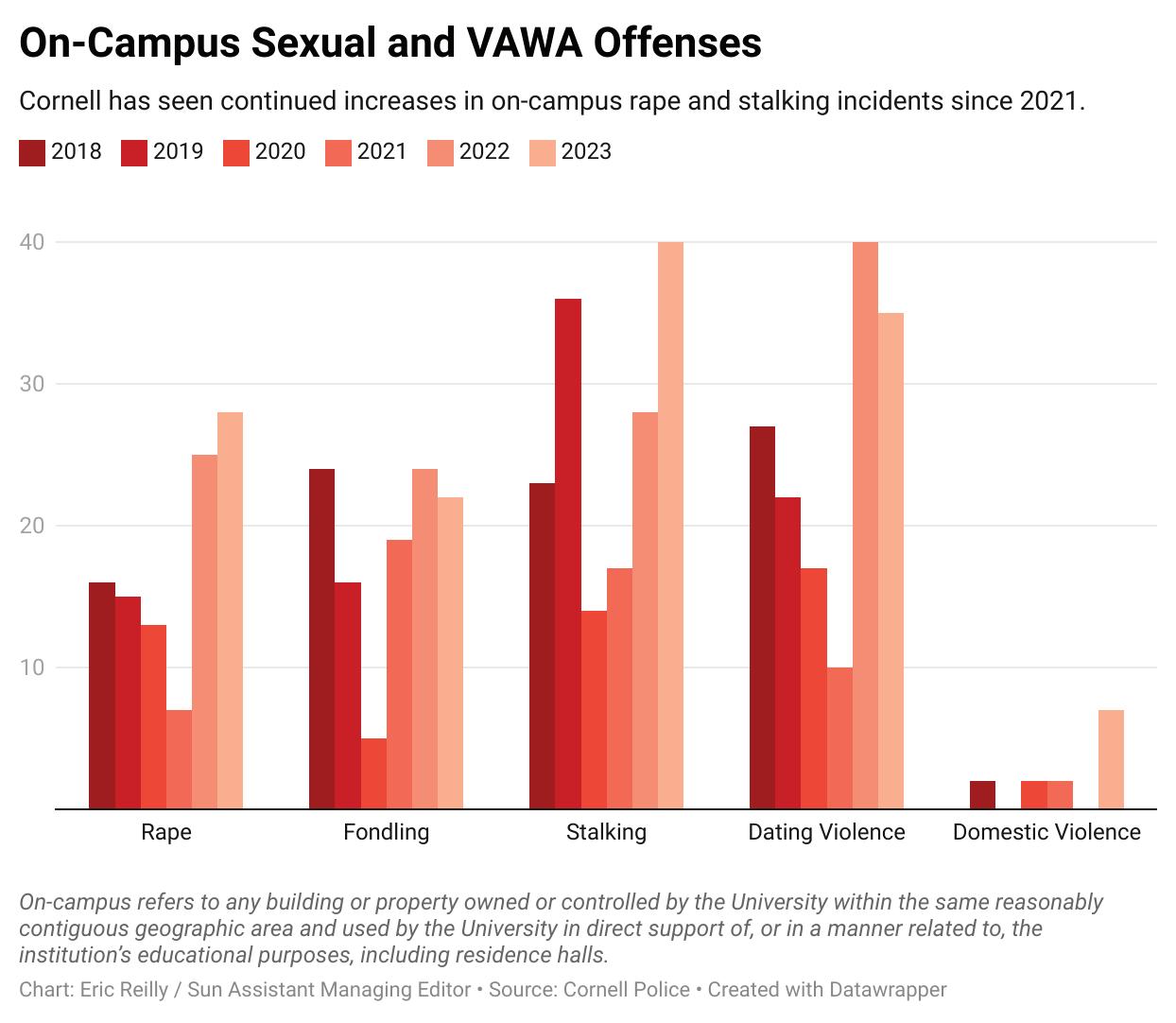 Forty on-campus occurrences of stalking were reported in 2023, the greatest number within the last six years. Cornell saw slight decreases in dating violence and fondling, with 22 and 35 reports, respectively. Domestic violence, which has recently accounted for no more than two offenses per year, was reported seven times in 2023.