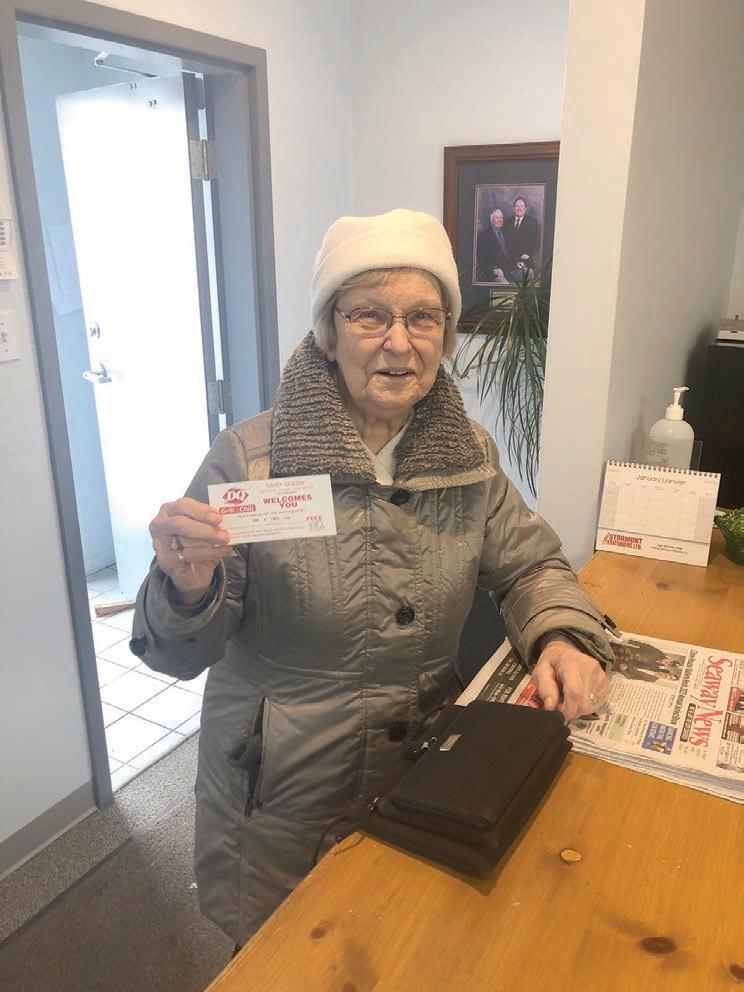 Pictured is Bernadine Greffe picking up her Dairy Queen Cake coupon after winning the Let’s Celebrate contest in the February 1st issue of Seaway News. Bernadine is celebrating her 90th birthday and Seaway News was happy to help her celebrate this special occasion. Happy Birthday Bernadine!