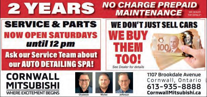 www.cornwallseawaynews.comWednesday, March 8, 20233 2 YEARS NO CHARGE PREPAID MAINTENANCE All lease payments are based on 16,000 km per year and are plus taxes and licencing with first payment and upfront fees due on delivery. See dealer for details*. LEASE FOR 60 MONTHS $6660* 4.99% @ OAC WEEKLY LEASE FOR 9065 LEASE FOR 60 MONTHS $12268* @ WEEKLY 60 MONTHS $17586 @ WEEKLY LEASE FOR 60 MONTHS $10207* @ WEEKLY 2023 Outlander PHEV ($5,000 Government Rebate WOW!) SERVICE & PARTS NOW OPEN SATURDAYS until 12 pm Ask our Service Team about our AUTO DETAILING SPA! WE DON’T JUST SELL CARS WE BUY THEM TOO! See dealer for details 7.99%OAC 7.19%OAC 5.39% OAC 5.49% OAC GT models shown GT models shown GT models shown GT models shown GT models shown
