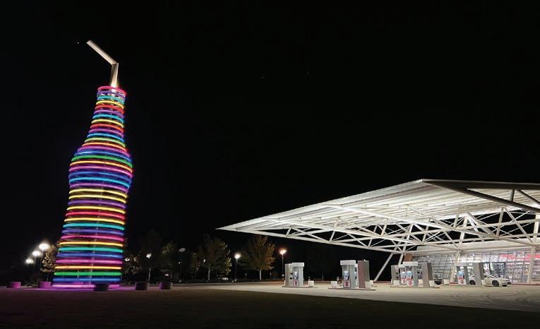 Indian Territory to international celebrity. The museum sits near land he chose for his retirement, preserving his legacy in photographs, film and words that still resonate. That legacy feels especially poignant today as Rogers’ former California home and ranch in Los Angeles were destroyed last January in the Palisades fire. Leaving Claremore, the road widens, the scenery slowly flattens, but more roadside wonders are to be found ahead. One is the Blue Whale of Catoosa, just off the highway near Tulsa. Originally built in the 1970s as a swimming hole by a local family, the whale has since become a Route 66 icon. For our next icon, we made sure to visit at night when the Pop’s Giant Soda Bottle at 660 W. Highway 66 in Arcadia, Oklahoma puts on quite a show, changing from hot pink to blue to green to a myriad of colors.