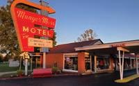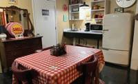 that feels frozen in the golden age of road travel. Barbara and I stayed in the motor court’s former garage and the interior décor was loaded with 1950s flashbacks: a Rotary dial phone, oil drum trash cans, a classic clock radio above our Philco antique refrigerator and a sign on the bathroom door that read: Restroom is locked. Ask Attendant for key.