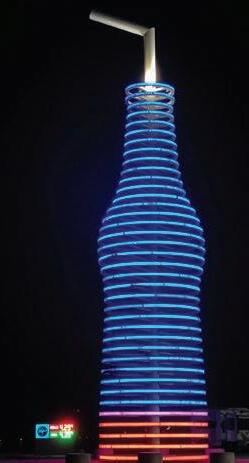 At Pop’s 66 Soda Ranch, you can fill up your gas tank and your own tank with one of more than 700 types of soda pop at the convenience store, all the while watching the changing LED lights on the 66-foot-tall pop bottle.