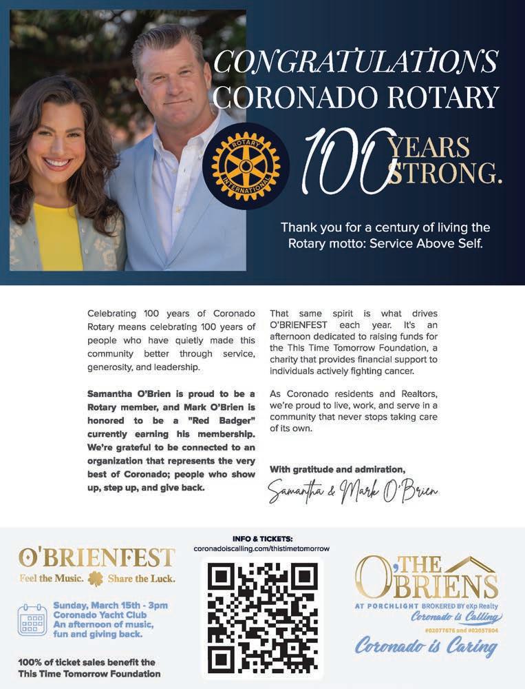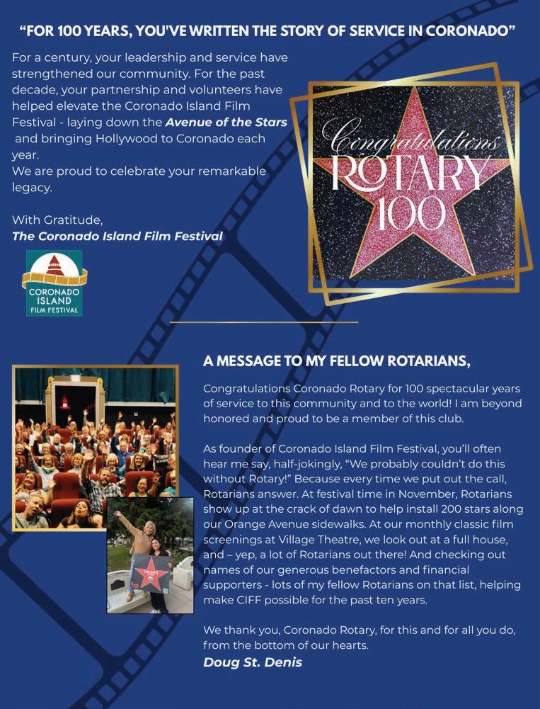 I’d like to thank Dean Eckenroth and the entire Coronado Eagle/Coronado Magazine team for making this issue happen, Kris Grant for coordinating the articles, the Rotary 100 Committee for making this year so much fun, and all of the club members for taking the time to write about the projects and various facets of our club that they are passionate about.