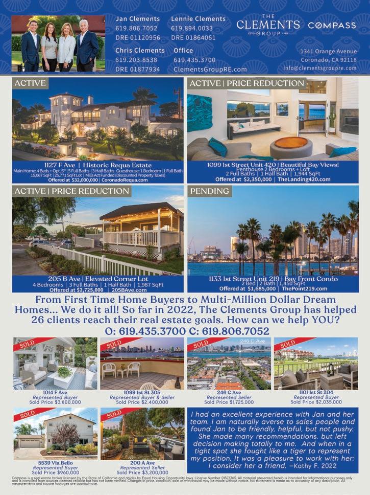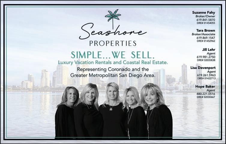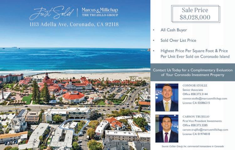 LOOKING TO BUY OR SELL? CALL US! Sales: 619-435-6234 • Vacation Rentals: 619-435-6238 • 800-677-5124 Veteran Owned CoronadoShoresCo.com FEATURED LISTINGS We built them, We sell them, We lease them Martha Kuenhold DRE#01369875 619-987-7725 Raquel Fernandez DRE#01945891 619-453-4513 John Harrington DRE#01210260 619-200-8504 Myssie McCann DRE #02145422 Owner/Broker Coronado Shores Co. Felicia Bell DRE #00429681 619-920-9124 Ara Koubeserian DRE#00454510 619-339-2383 Stacy Bell Begin DRE#02014995 619-200-9184 Ryan Koubeserian DRE#01738738 619-339-9736 info@coronadoshoresco.com La Princesa #905 $1,595,000 1BD/1BA The Legend 325 7th Avenue #1701 San Diego, CA 92101 $845,000 • 2BD/2BA El Camino #PH14 $1,375,000 1 BD/1 BA Call Martha Kuenhold SOLD Call Ara Koubeserian or Ryan Koubeserian