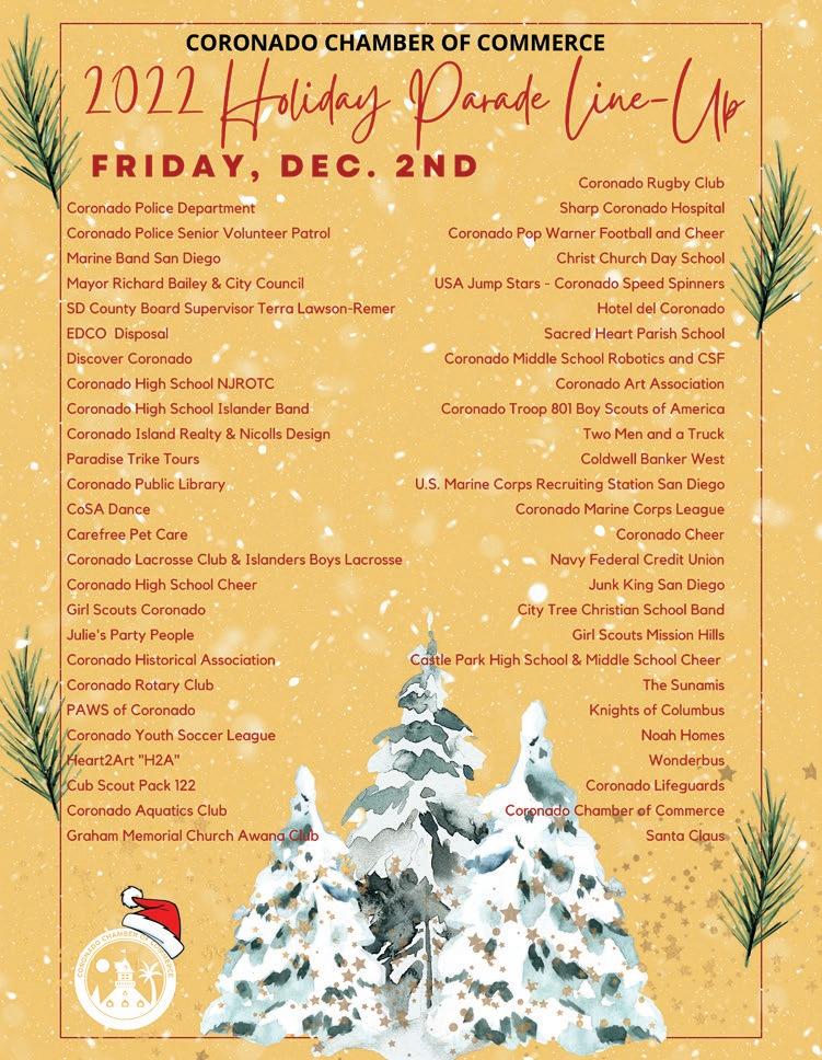 Holiday Parade D E C E M B E R D E C E M B E R 2 N D , 2 0 2 2 2 N D , 2 0 2 2 L E T I T S N O W J I N G L E B E L L S D E C K T H E H A L L S J I N G L E B E L L R O C K F R O S T Y T H E S N O W M A N H A V E A H O L L Y , J O L L Y C H R I S T M A S S A N T A C L A U S I S C O M I N G T O T O W N R U D O L P H T H E R E D N O S E D R E I N D E E R W E W I S H Y O U A M E R R Y C H R I S T M A S C O M M U N I T Y C A R O L S S O N G S & P E R F O R M A N C E S C o r o n a d o P h i l h a r m o n i a C o r o n a d o C o m m u n i t y C h o r u s C o r o n a d o C o m m u n i t y B a n d Performances By Coronado Magazine | P21