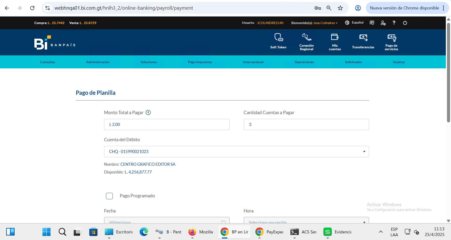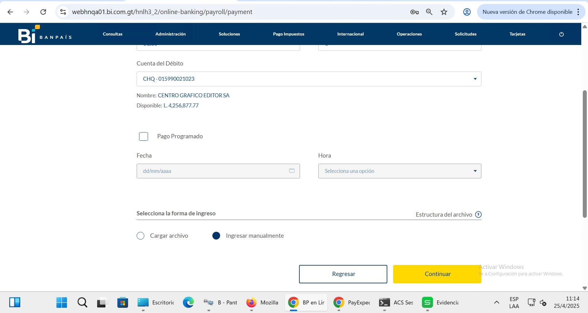 Para programar una planilla, haz clic en la opción Pago Programado, ingresa la fecha y hora en la que deseas que se ejecute el pago.