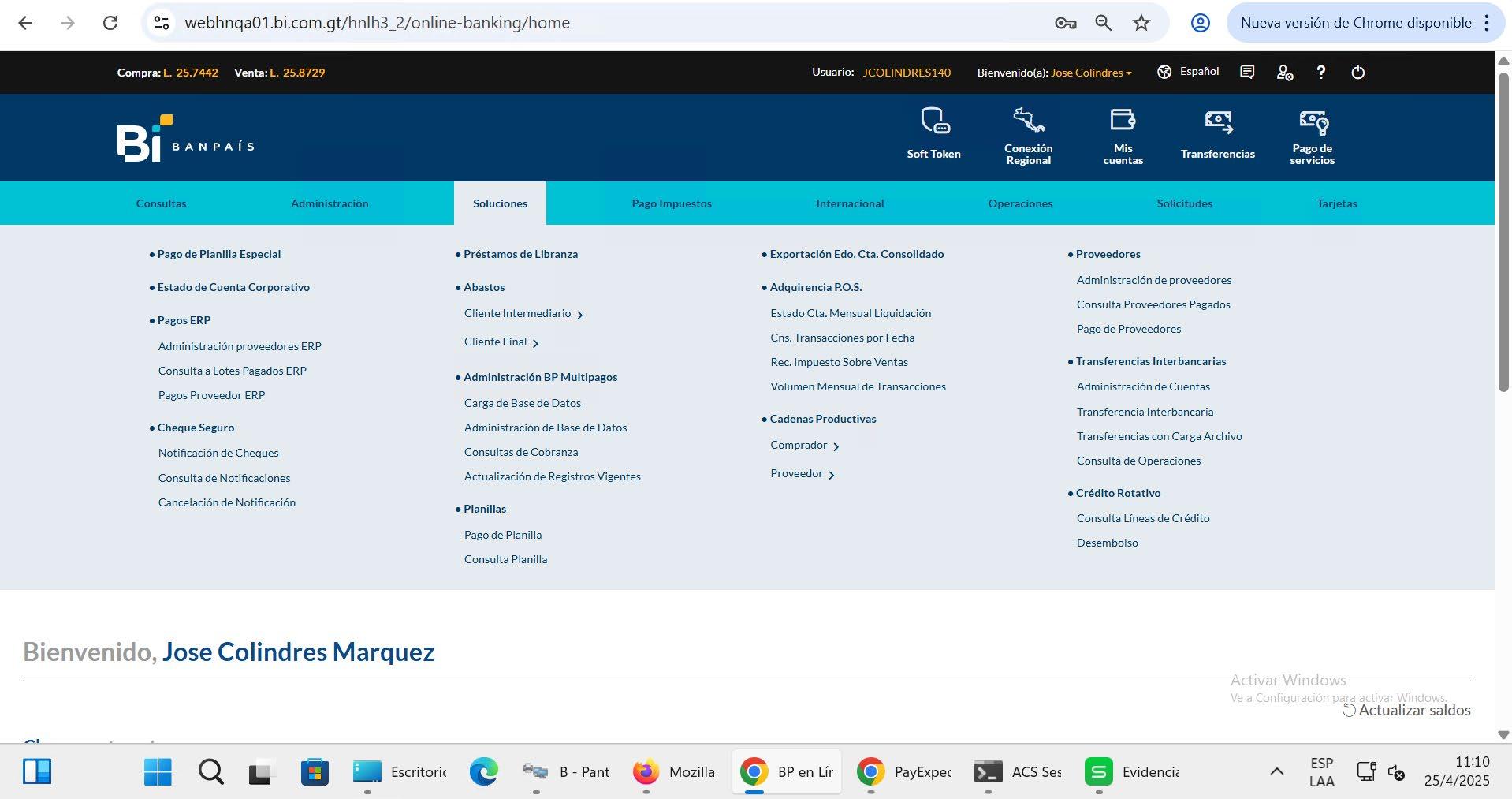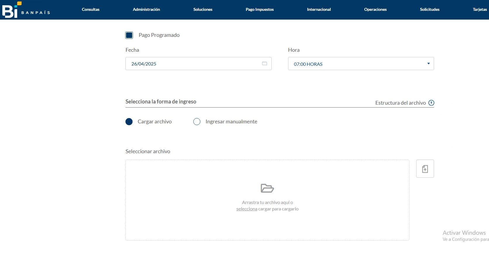 Ingresa a Banca en línea Banpaís y en el menú Soluciones selecciona: Pago de Planillas.