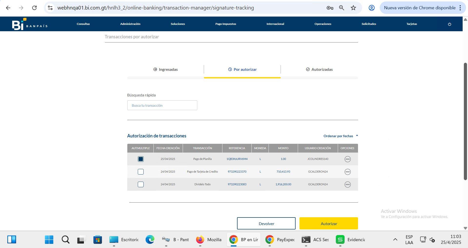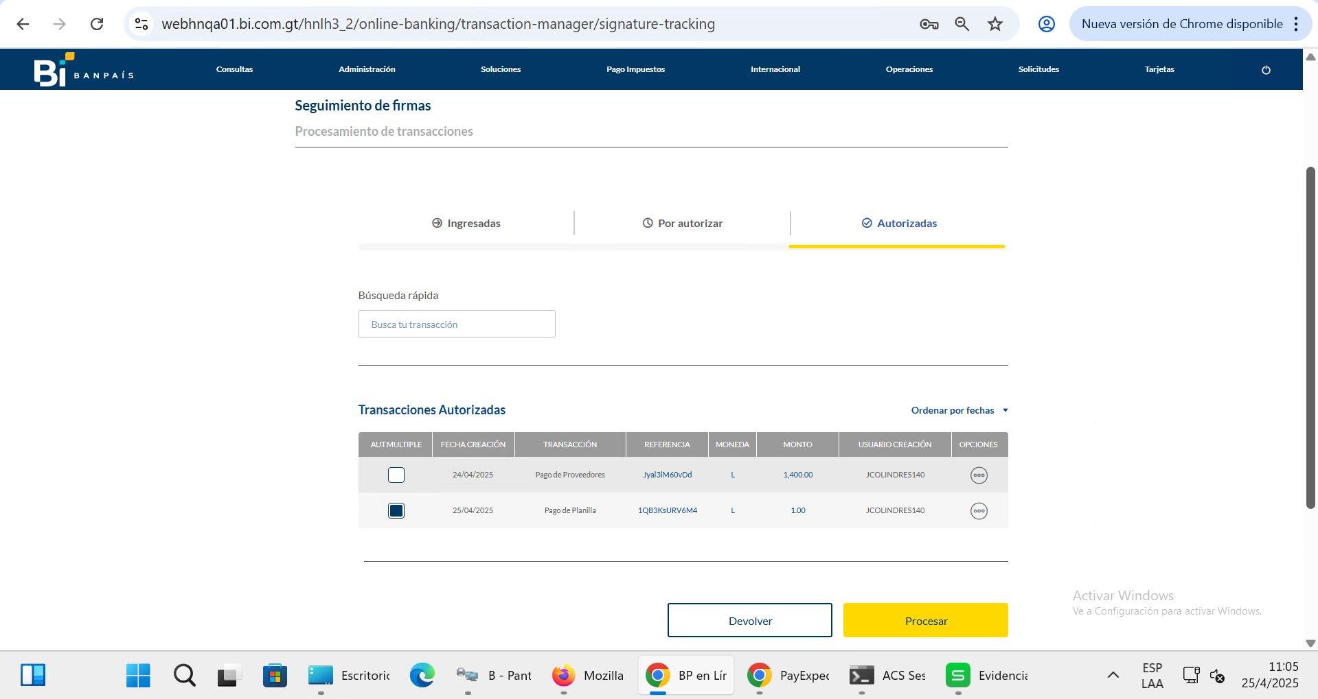 En la sección de Autorizadas encuentras una lista de las planillas firmadas, selecciona la que desees para procesarla.