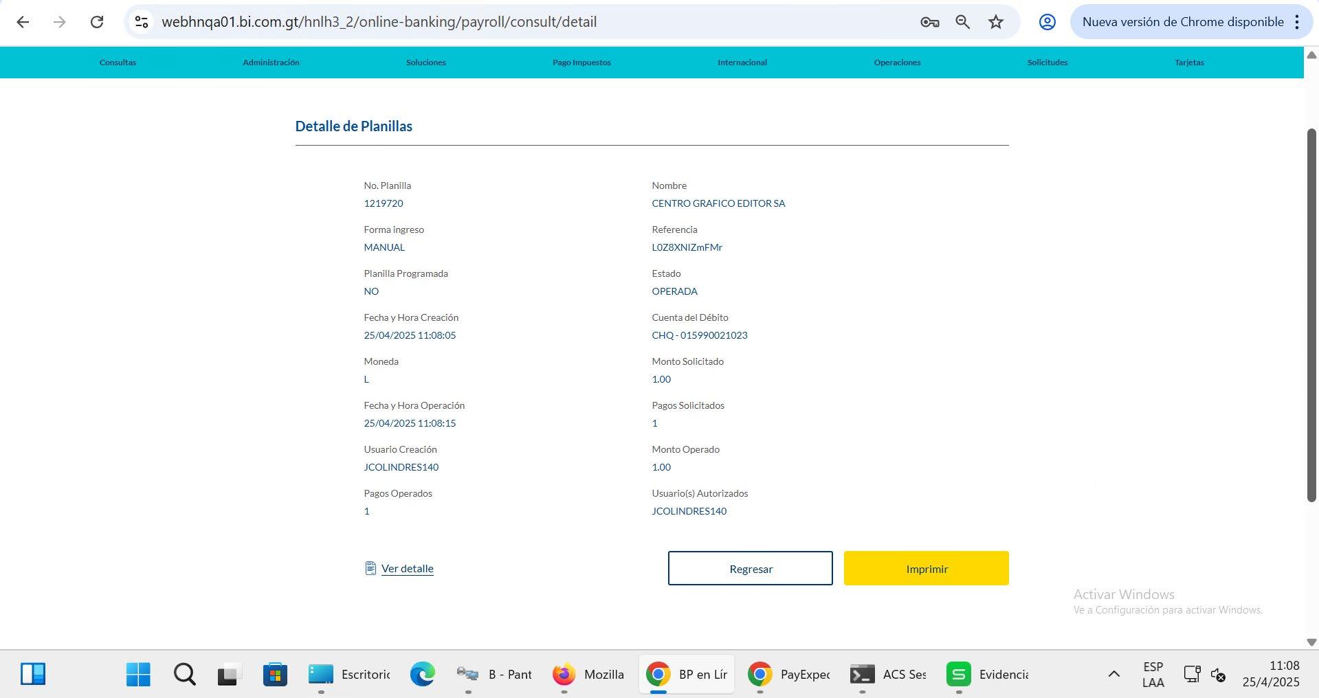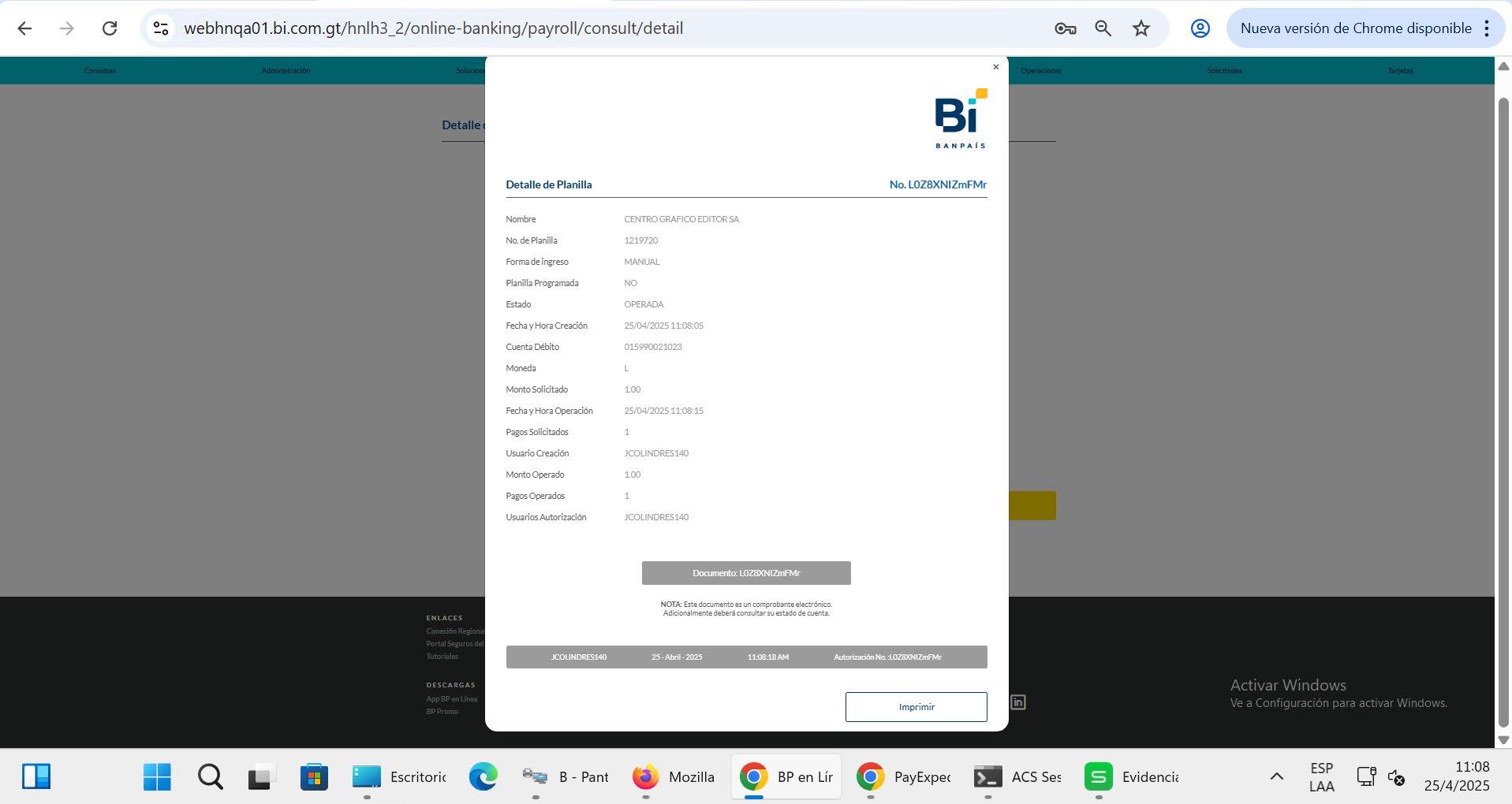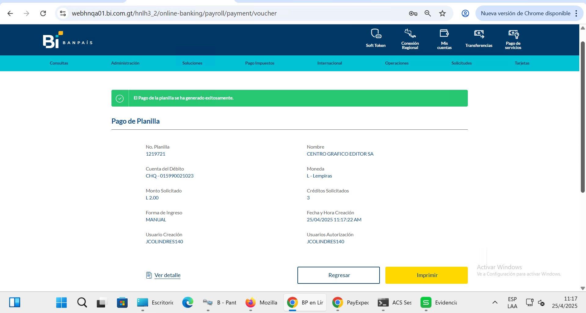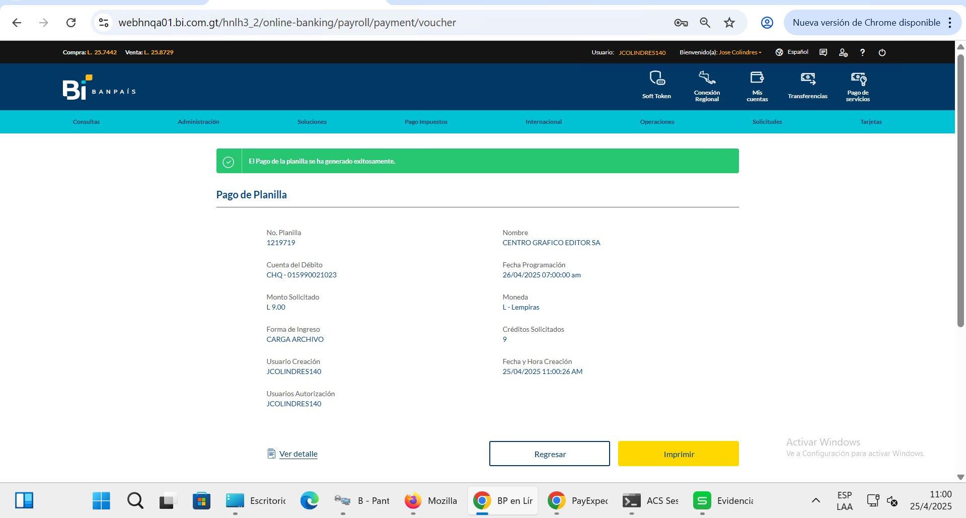 ¡Listo! Se imprimirá la hoja de la planilla ejecutada.