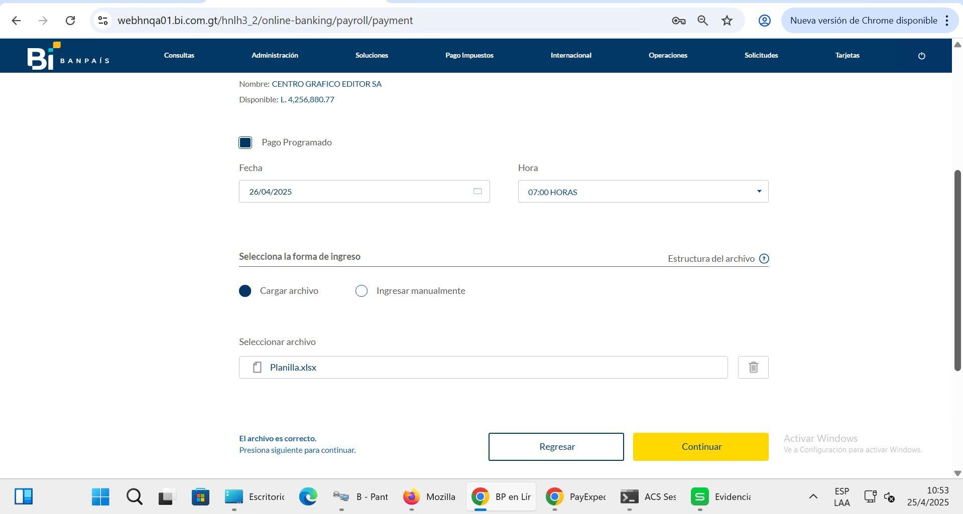 Haz clic en la opción Carga Archivo y Continuar cuando esté listo el archivo que deseas.
