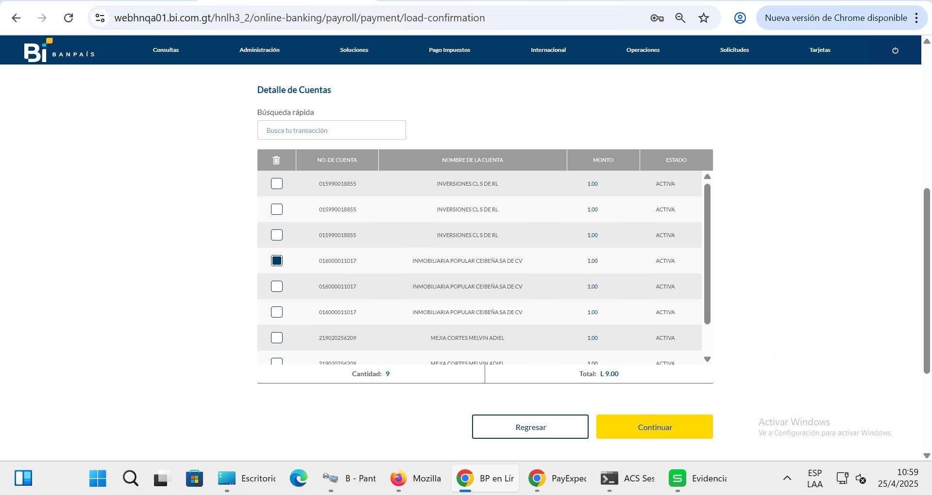 Desliza hacia abajo para ver el detalle de las cuentas cargadas en el archivo. Puedes marcar y eliminar cuentas si lo necesitas.
