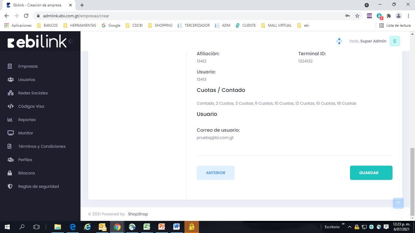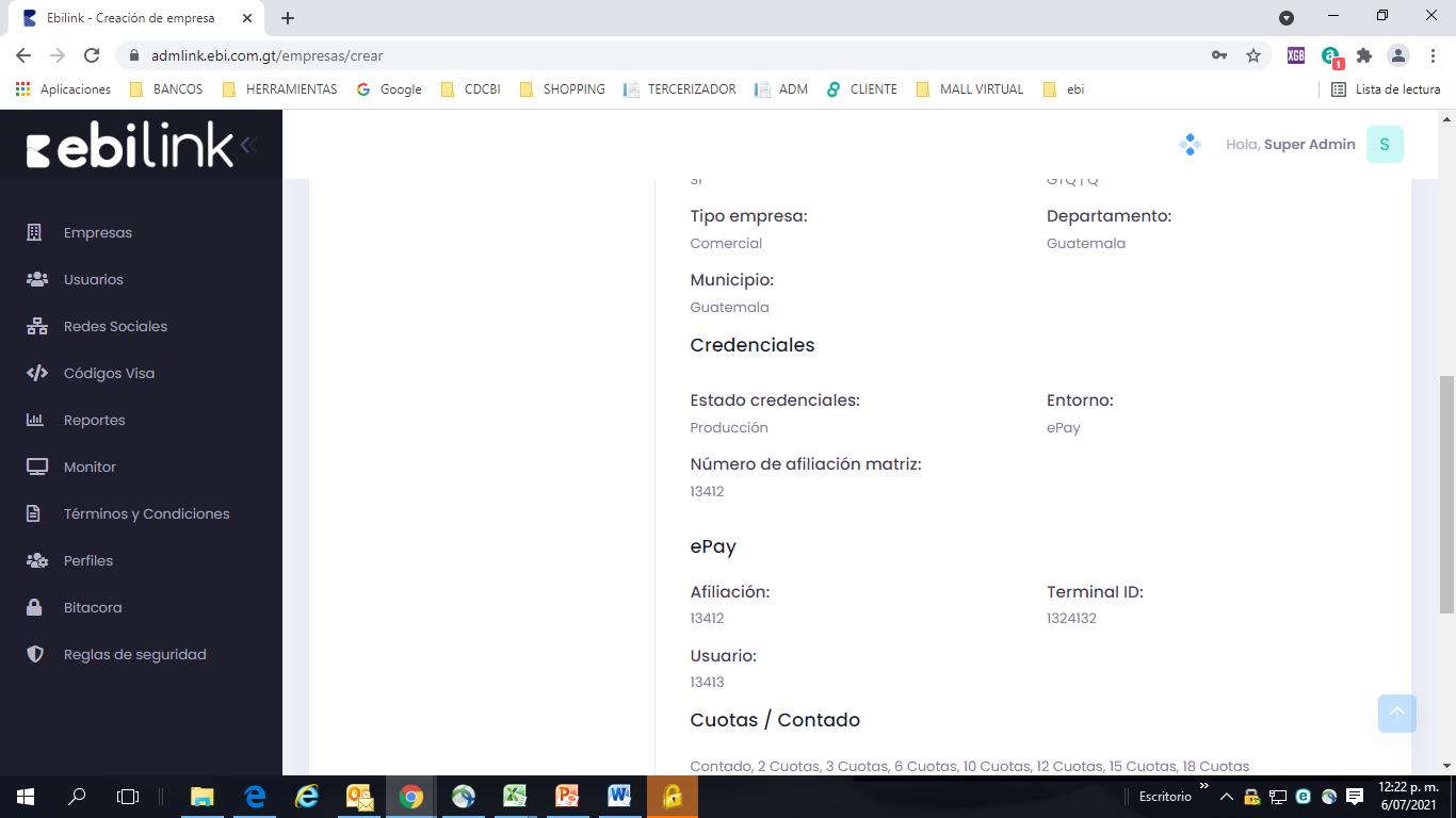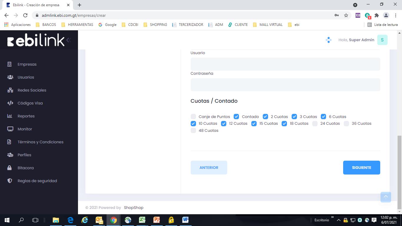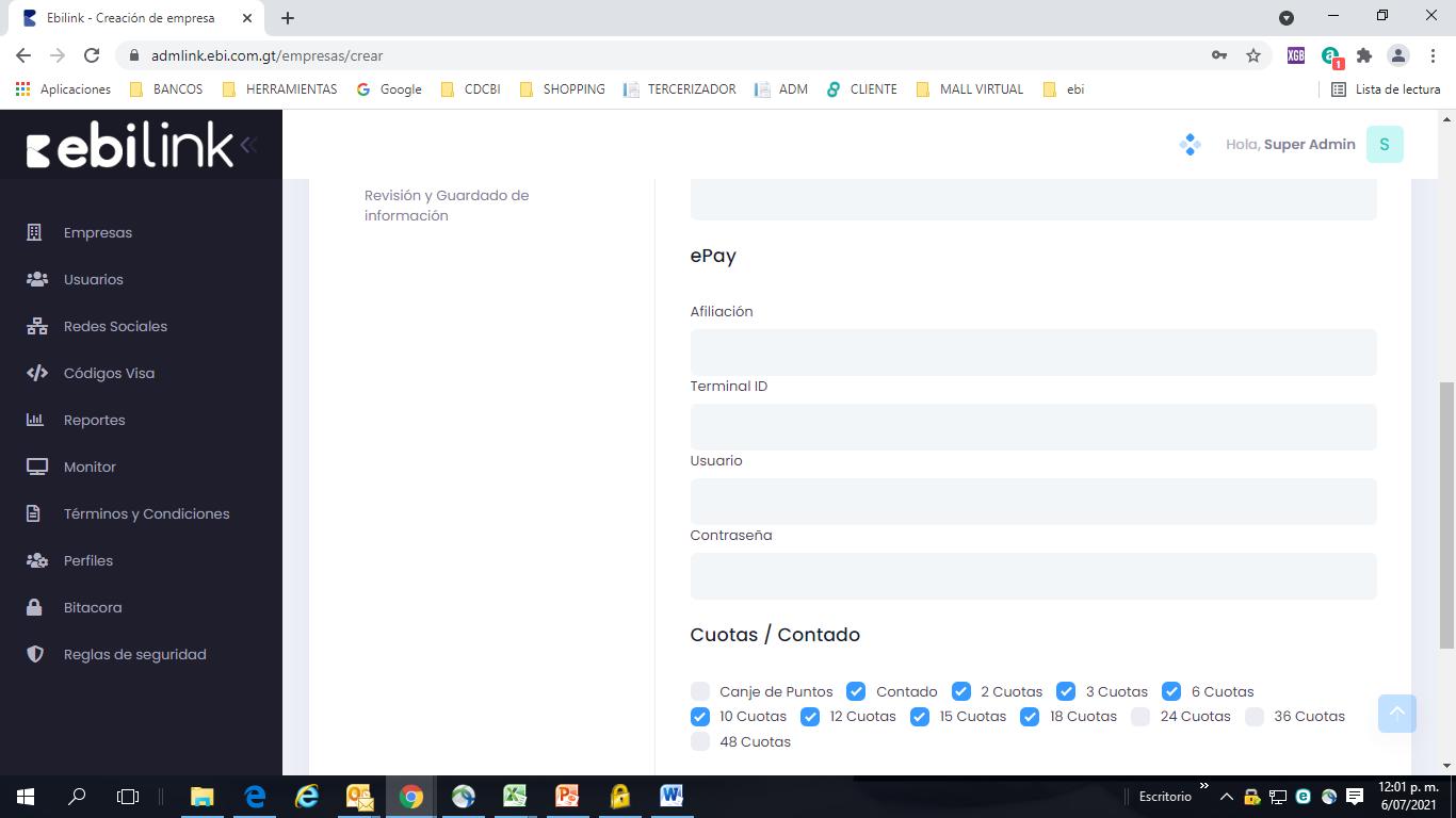 Cuotas/Contado: se seleccionan las opciones de cuotas de la empresa que viene en el archivo “Credenciales ebi” adjunto al caso de CRM. Importante que NO debe estar seleccionada la opción “Canje de puntos”