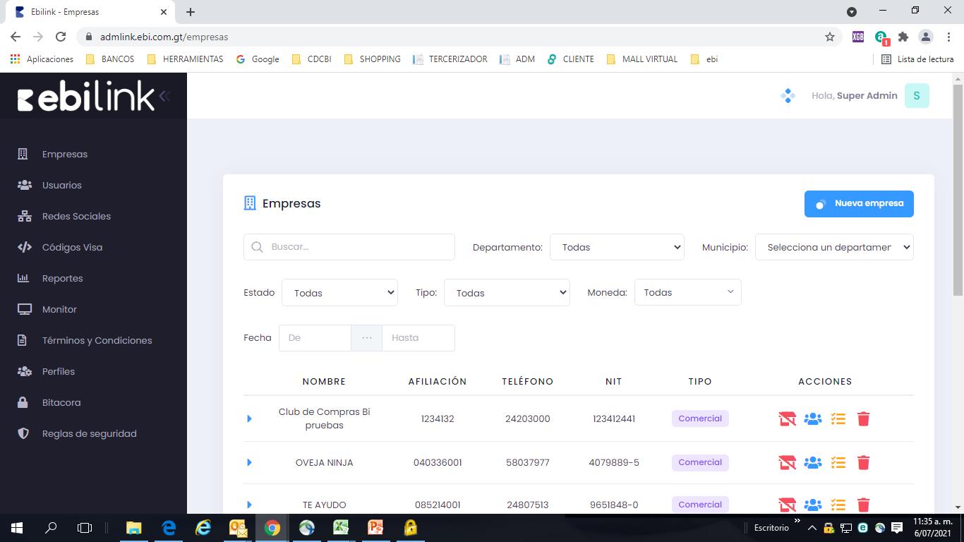 Este menú muestra las empresas afiliadas al proyecto, en la parte superior derecha hay un botón con la opción “Nueva Empresa”