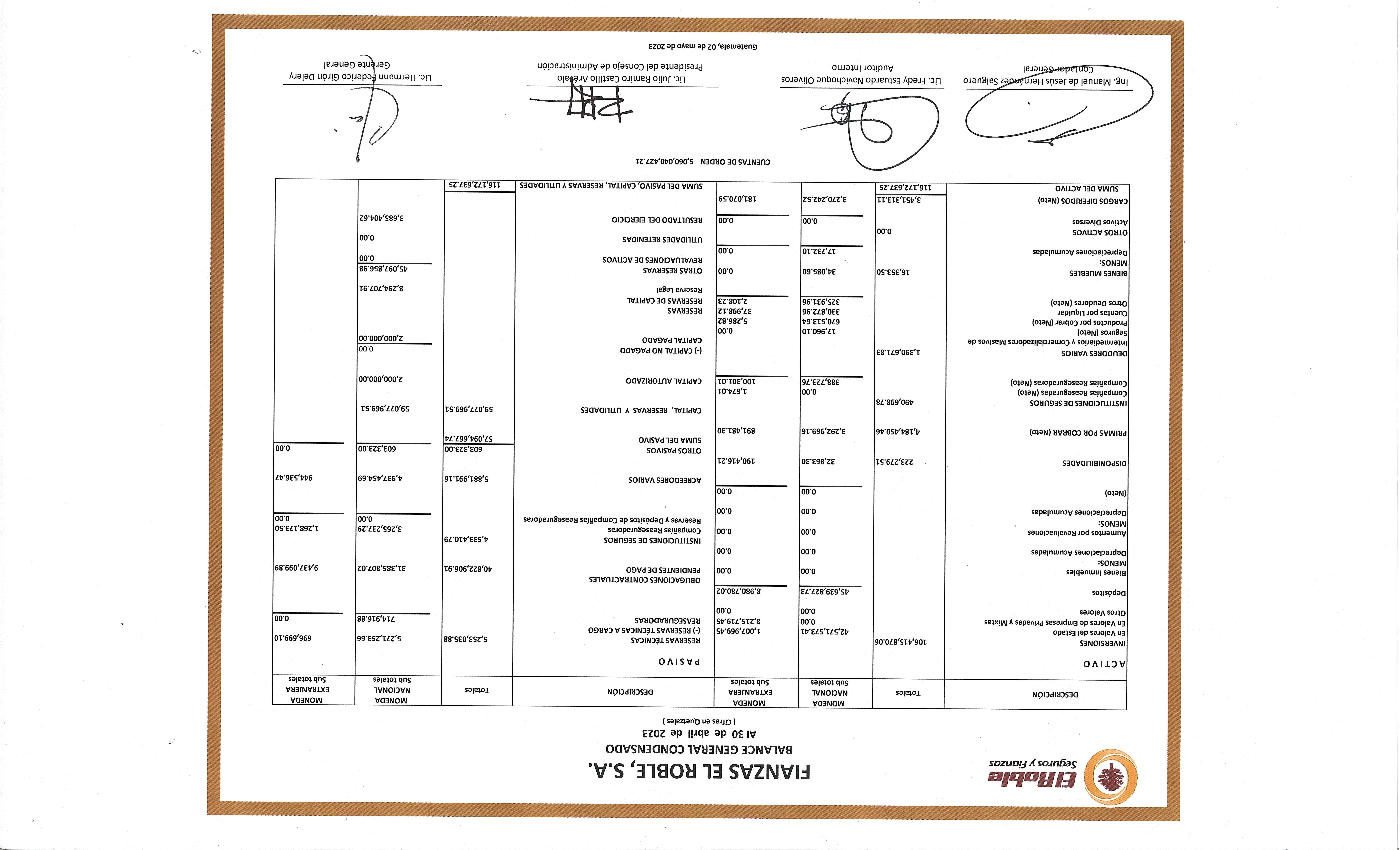 co G¡rón Delery Presidente del Consejo de Administración Guatemala,02 de mayo de 2023 DEscRrPcróN Totales MONEDA NACIONAL Süb total€s MONEDA EXTRANJERA Sub totales DEscRtPoóN Totales MONEDA NACIONAL Sub tdtále. MONEDA EXTMNJERA Sub totales 106,41s,870.06 223,279.51 4,78Á.,45O.46 490,598.78 1,390,671.83 15,353.50 0.00 3,4s1,313.11 42,57t,573.41 0.00 0.00 45,639,427.73 0.00 0.00 0.00 0.00 0.00 32,853.30 3,292,969.16 0.00 384,723.76 17,950.10 670,573.64 330,872.96 325,931.96 34085.60 17,732.t0 0.oo 3,270,242.s21 1,007,969.4s 4,2$,779.45 0.00 8,980,780.02 0.00 0.00 0.00 0.00 0.00 790476.21 891,481.30 !,674.O7 100,301.01 """1 s,zae.azl 17,99a.721 z,l¡e.zzl t; o.ool ;1 '*^;l PASTVO