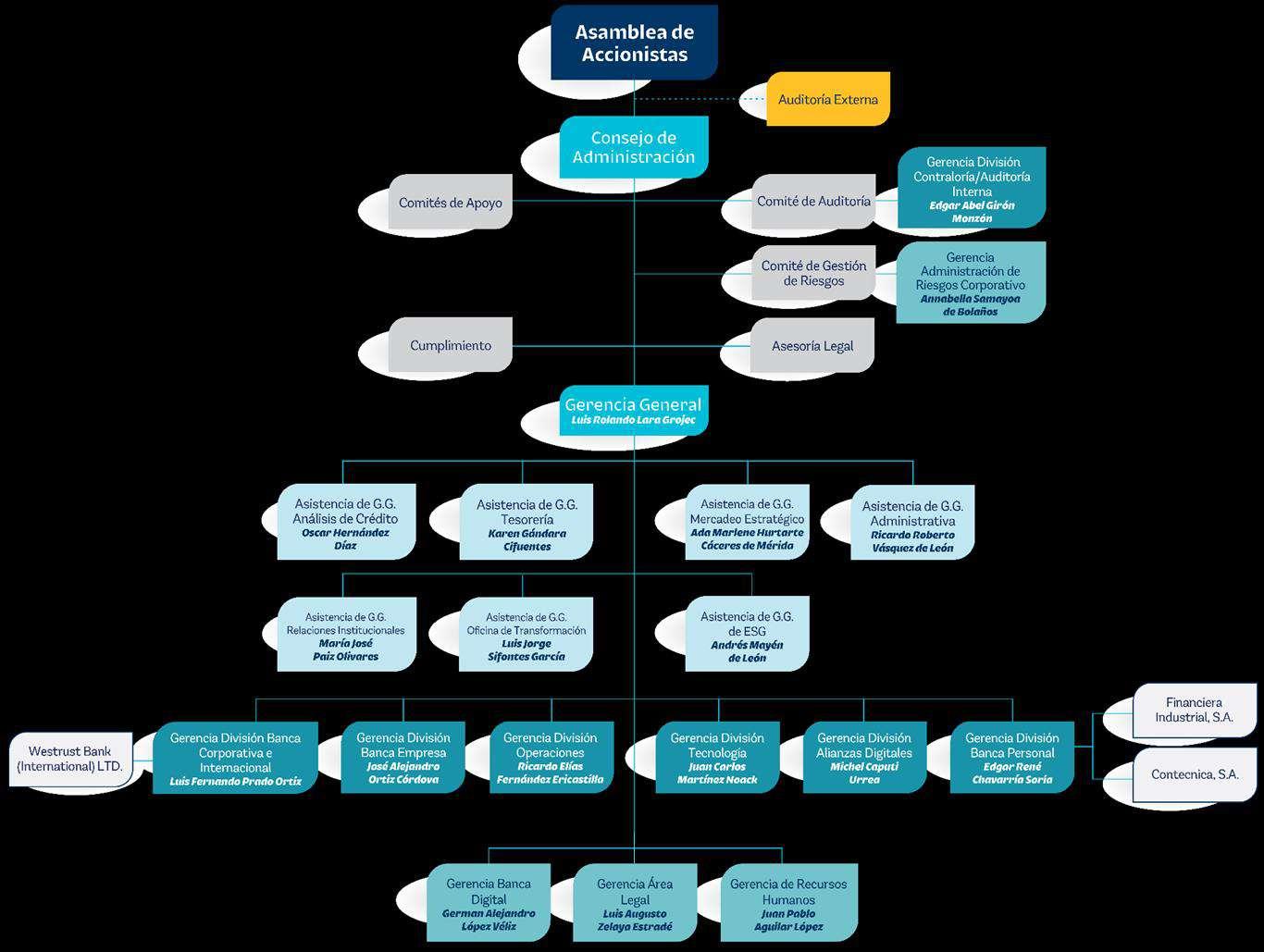 La estructura para la gobernabilidad de Banco Industrial, S.A., establecida y aprobada por el Consejo de Administración, contempla un esquema de Comités que poseen la responsabilidad de velar por el cumplimiento de los lineamientos definidos y que a su vez son los pilares de un adecuado Sistema de Control Interno, conforme a la naturaleza, complejidad y riesgos que conllevan las actividades de Banco Industrial, S.A.