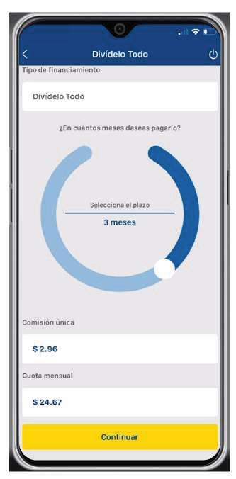 Selecciona la cantidad de meses en los que deseas dividir la compra, se te detallará el costo de la comisión y cuota mensual, luego presiona continuar.