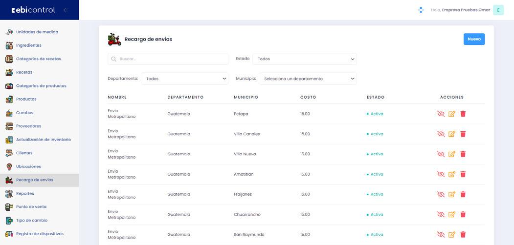 Configuración de cargos de envío en las compras realizadas, es posible generar todos los envíos a un departamento desde la creación.
