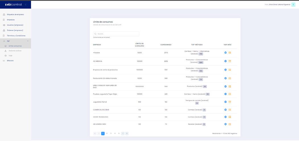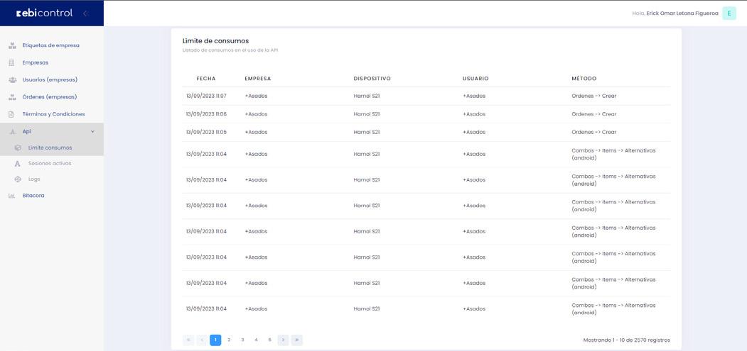 Configuración de cuántas veces puede consumir el comercios por hora las APIs, así como el detalle de los métodos que se han consumido