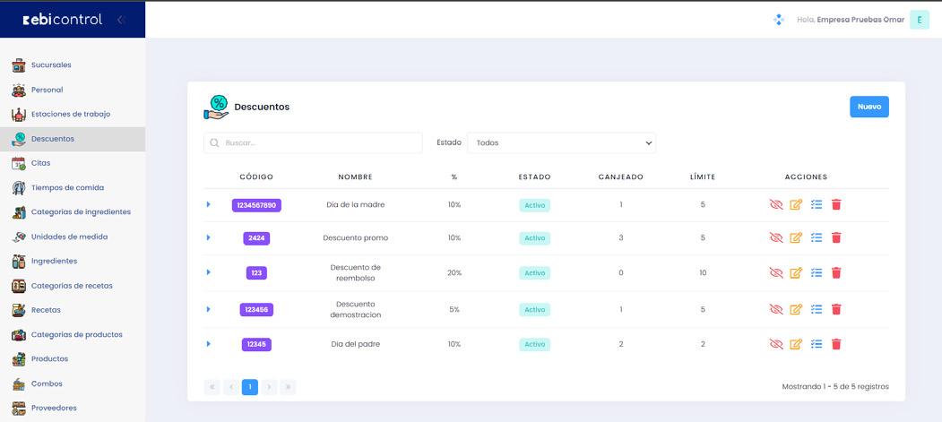 Registro de códigos de descuento, se utilizan en el pago