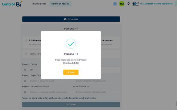 • Efectivo: Registra el monto recibido y confirma el pago directamente.