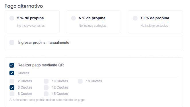 Es posible configurar propinas para las mismas, teniendo opción para registrar hasta 3 sugerencias de propinas pudiendo ser por monto fijo o porcentaje (este se calcula en función del consumo que se realice).