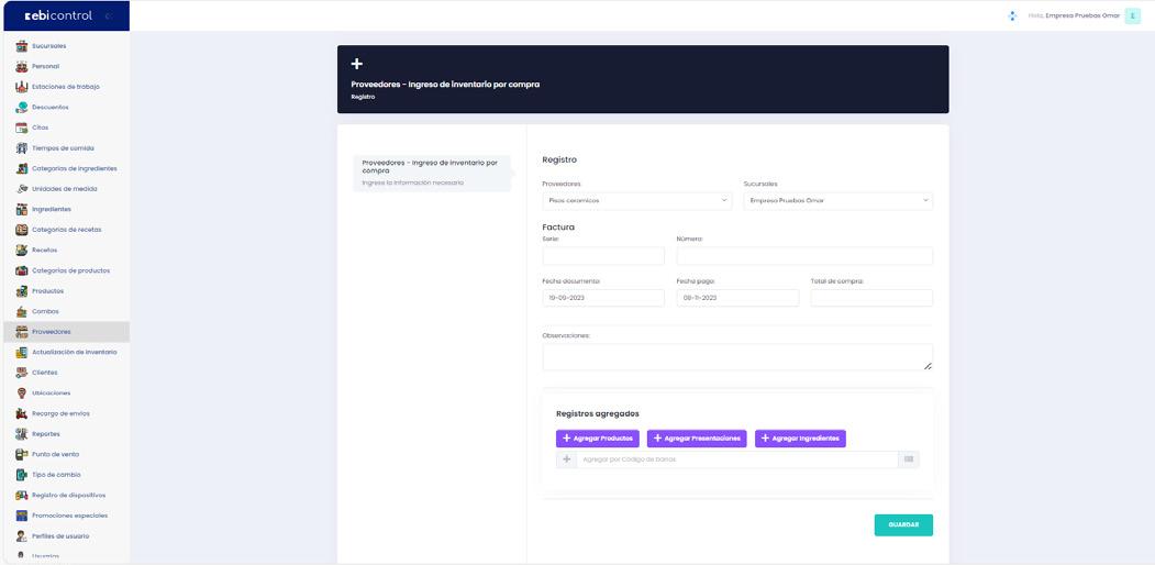 Permite ingresar compras de inventario y a su vez todas las unidades que se ingresaran se estarán asociando a una Sucursal, si el comercio cuenta con el módulo de sucursales podar escoger a que sucursal ingresar su compra, caso contrario todas las compras irán a la sucursal generada por defecto y la opción no estará disponible