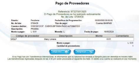 Al avanzar seleccionando Pagar, se mostrará la pantalla de confirmación y número de referencia. Si el pago de tu proveedor posee condiciones de firma para autorizar, el proceso de pago se completa en el servicio de “Seguimiento de transacciones” desde el menú de administración o presionando el botón “Ir a Seguimiento de Transacciones”.