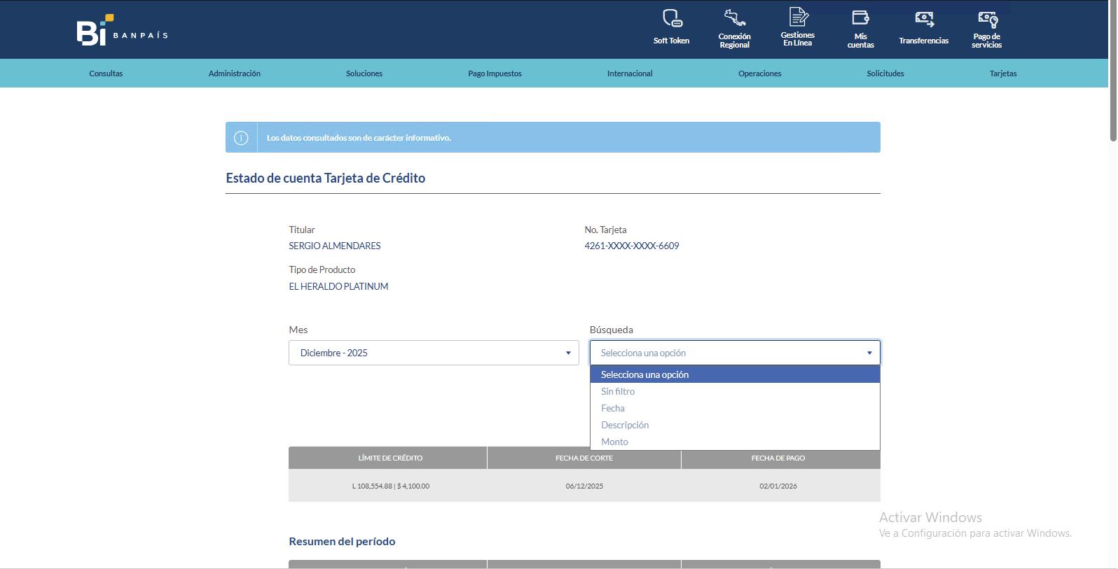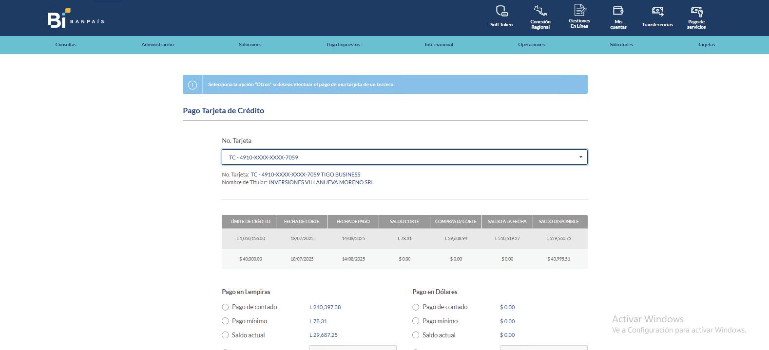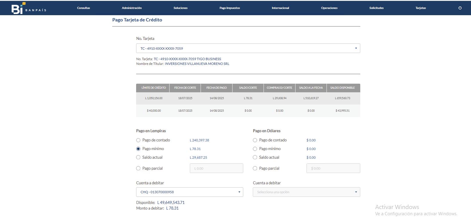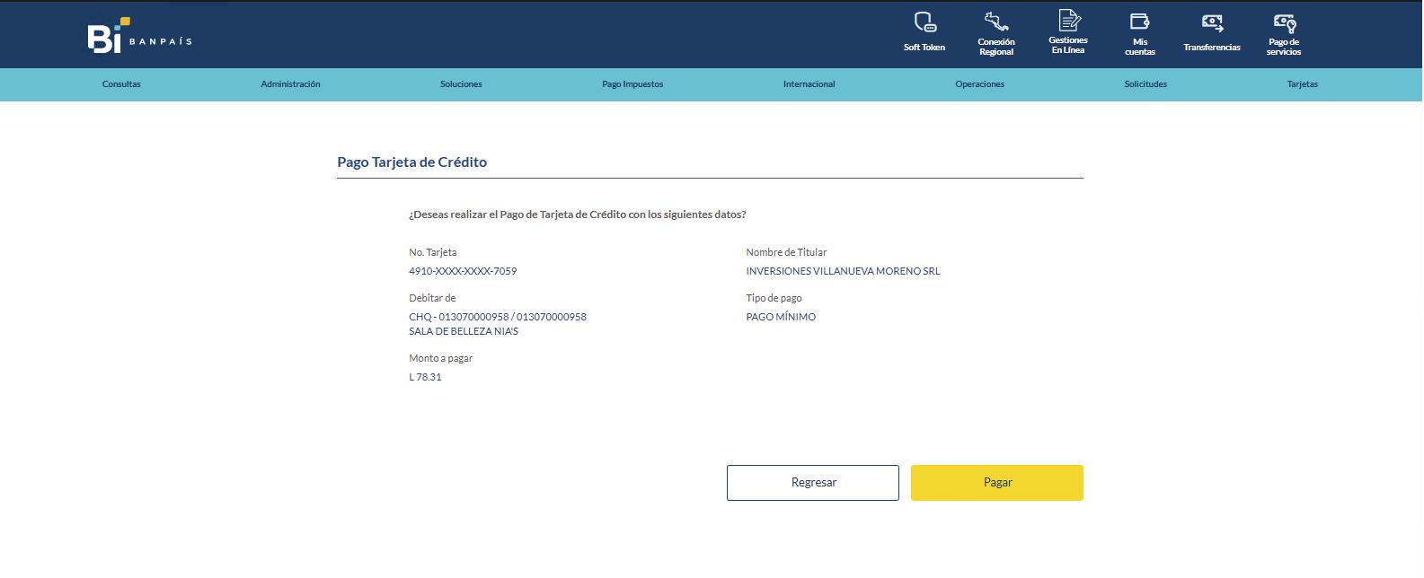 desde la Banca en Línea Banpaís Pago de Tarjeta de Crédito