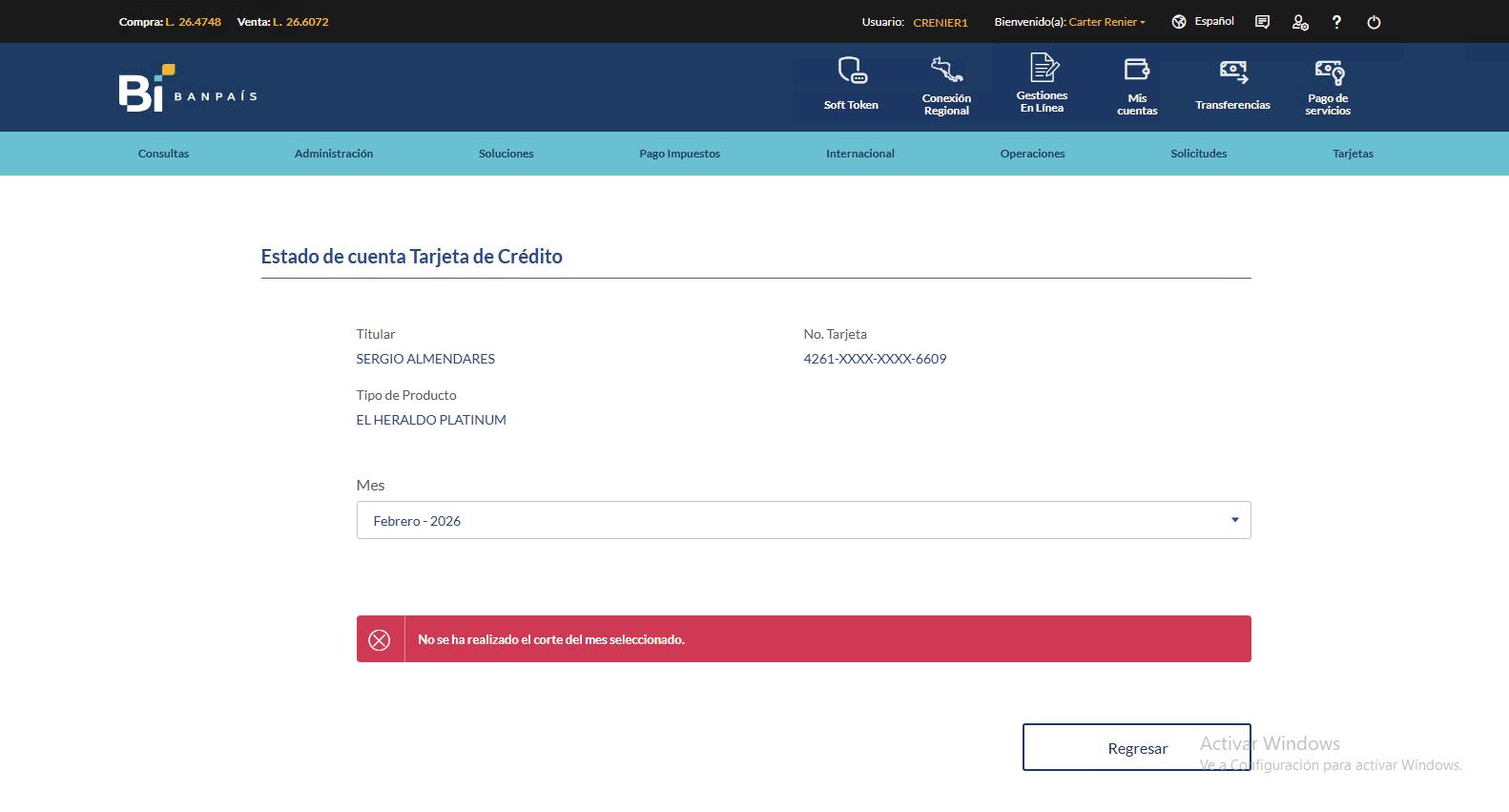 Elige la tarjeta de crédito activa que deseas pagar (cuando la selecciones aparece el nombre del titular).