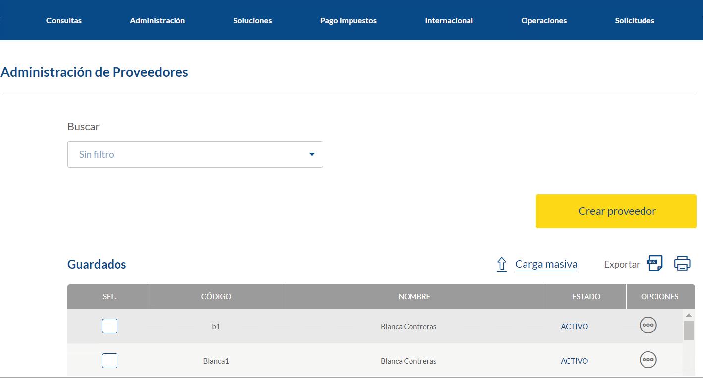 En Administración de Proveedores, haz clic en la opción Carga masiva (la encuentras abajo del botón Crear proveedor).