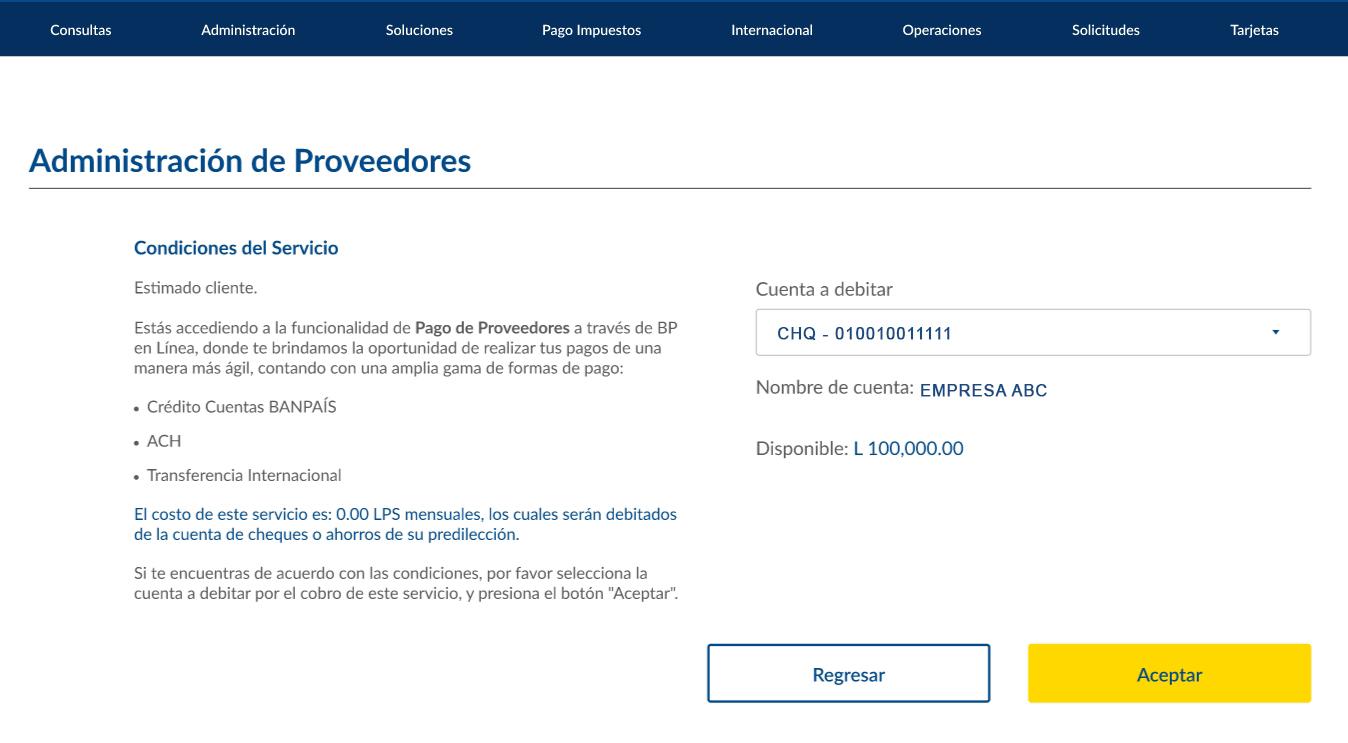 Actualmente el servicio de pago a proveedores no tiene costo, en pantalla se refleja L 0.00.