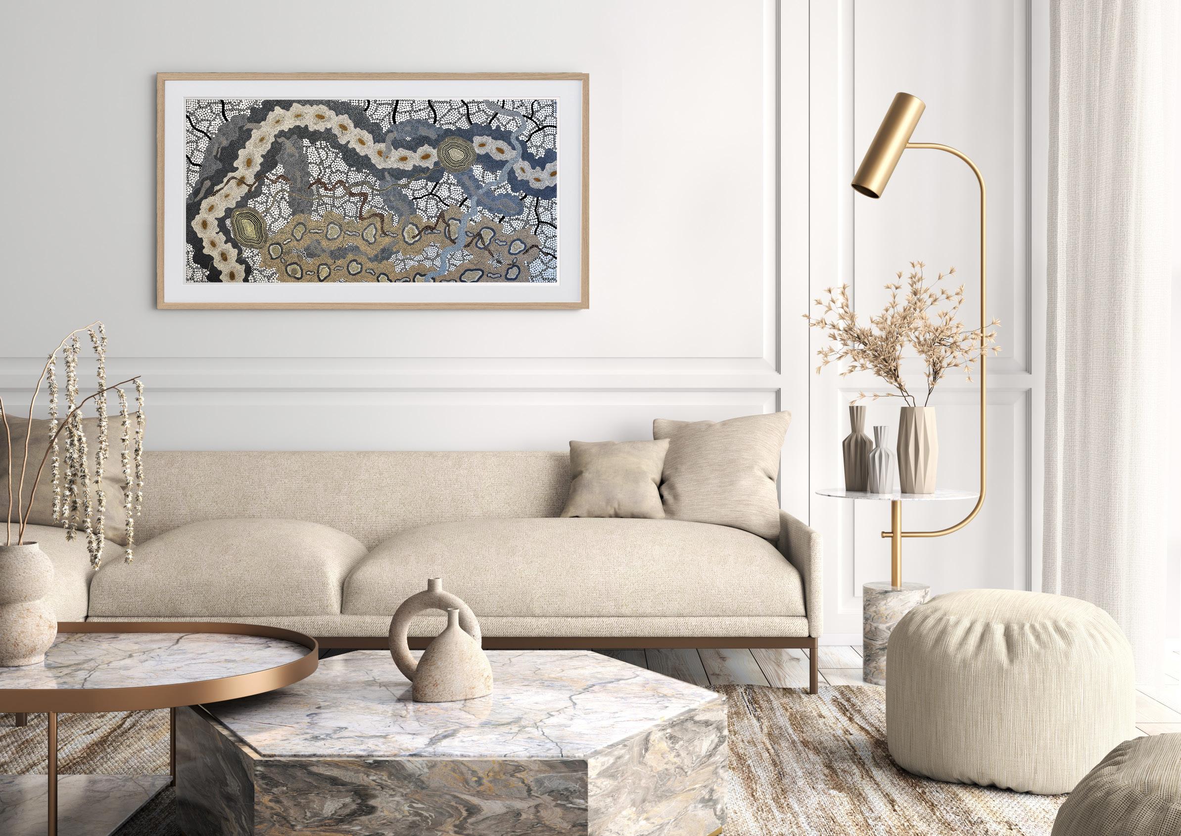 A special place where the birds got their colours by painting their bodies with elements from the land so they could dance. These colours permanently remained. This place is commonly known today as Razor Back hill. The artwork also references community gatherings or meetings with neighbouring tribes who would travel there for trade or business.