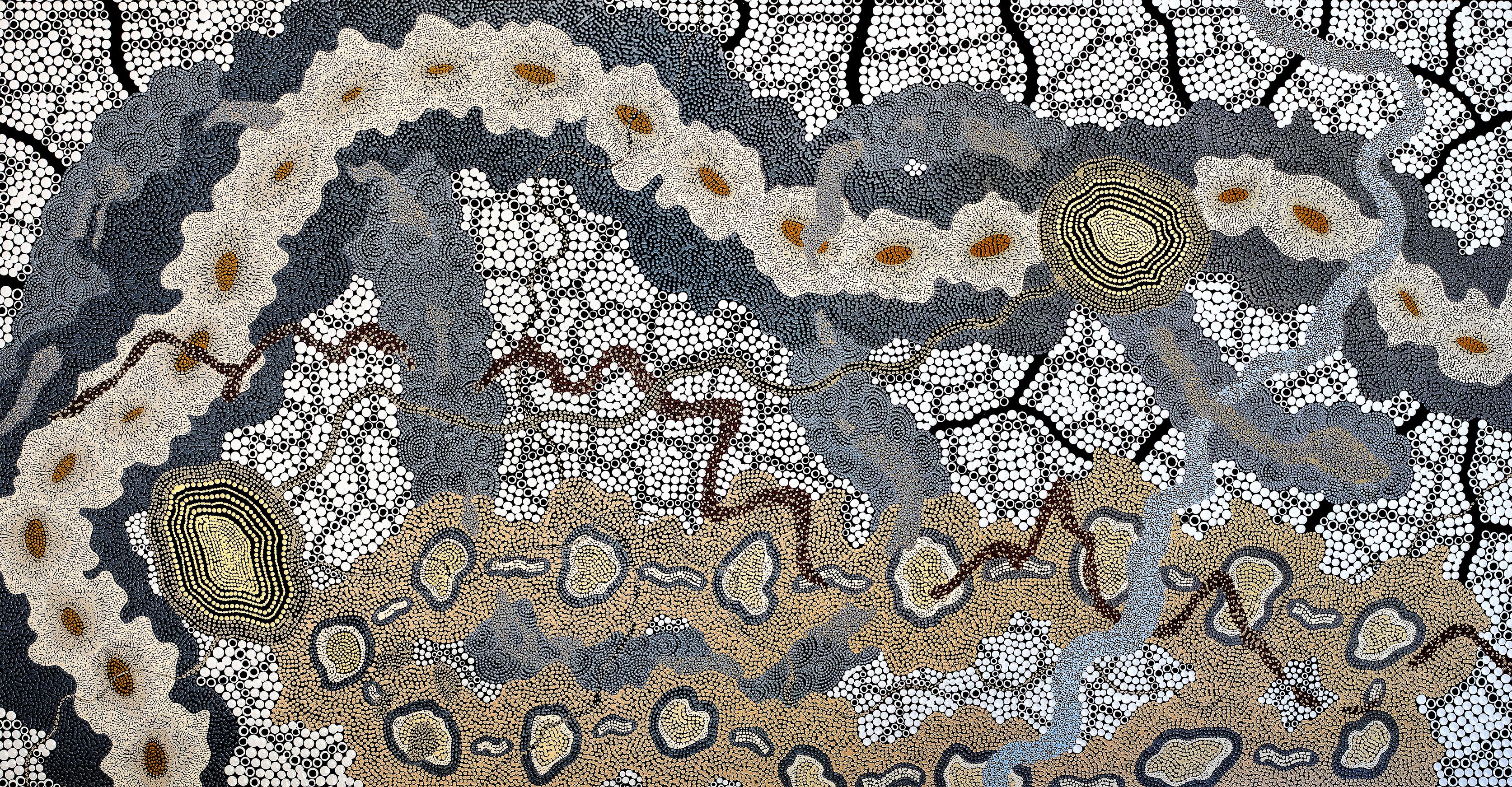 This is a representation of a small area of landscape on Minjungbal tribal land (Tweed Heads) pointing out to a special place called, Jungarra’s (pelican’s) corroboree ground.