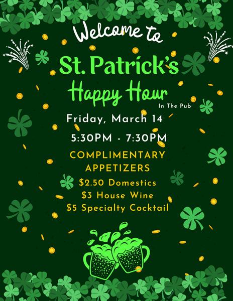 Join us for Happy Hour in the pub with complimentary appetizers.