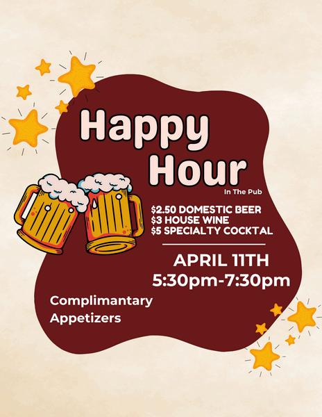 Join us for Happy Hour in the pub with complimentary appetizers.