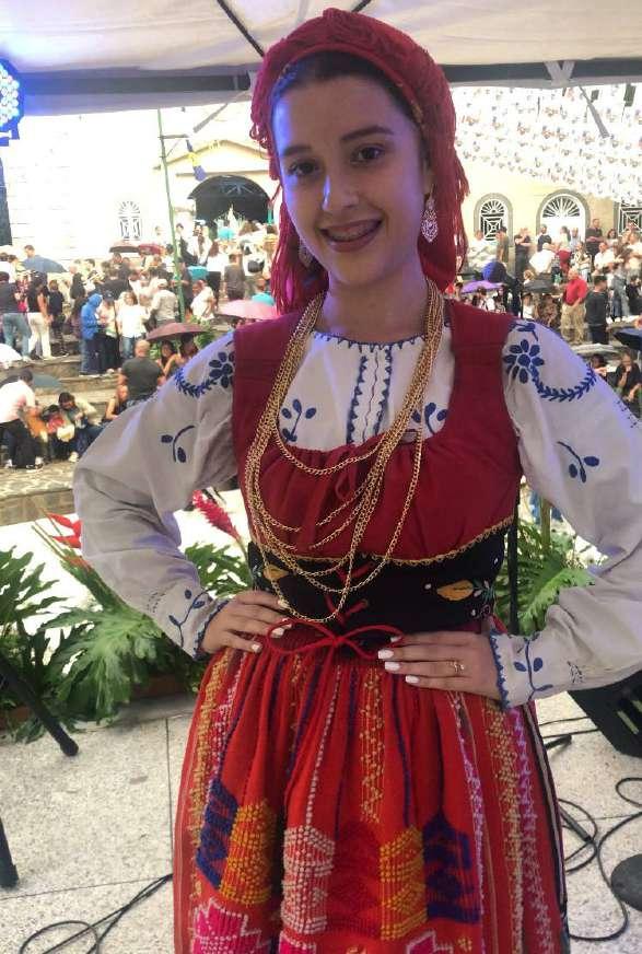 mujer, reflejan los tiempos en que el oro proveniente de Brasil impulsaba la prosperidad del país. Un ejemplo destacado de este esplendor es la filigrana, una delicada técnica de orfebrería que adorna diversas piezas del atuendo. La vestimenta está compuesta por una falda fruncida, un chaleco ajustado con cintas, una camisa blanca dordada, un delantal y una bolsa (algibeira). Además, la joyería de filigrana y los pañuelos, tanto en la cabeza como sobre el busto, complementan la elegancia del conjunto. En los pies, las mujeres lucen chinelas bordadas con oro y medias de encaje, realzando aún más la sofisticación del traje.