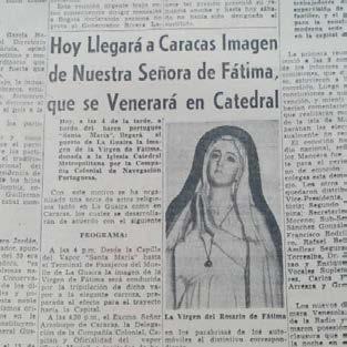 A história de hoje refere-se a uma «passageira» especial que viajou desde Lisboa a La Guaira, em maio de 1957, du rante 13 dias, na Capela do paquete: Nos sa Senhora de Fátima, materializada por uma imagem oferecida pela Com panhia Colonial à catedral de Caracas, para assinalar os 40 anos das Aparições Marianas de 1917, acontecimento que trouxe o lugar da Cova da Iria, próximo de Fátima, para o centro da vida católi ca.