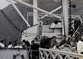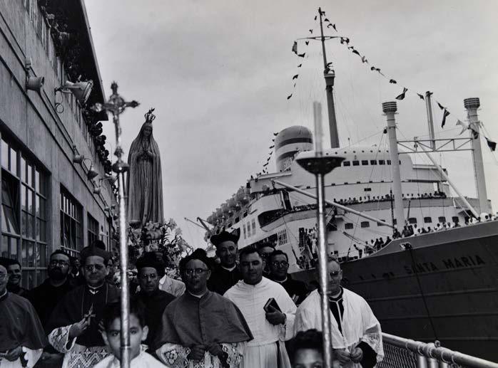 A imagem da Senhora de Fátima em barcou no SANTA MARIA a 1 de maio de 1957. Antes da partida de Lisboa, deco rreu a bordo um almoço oferecido pela administração da CCN para assinalar a iniciativa. O seu presidente, José Soares da Fonseca, apresentou a oferta à cate dral de Caracas como integrada na «con tinuidade de uma tradição portuguesa tão remota como a própria nacionalida de – a dilatação do Império, mas tam bém a dilatação da Fé através do Mun do». Das individualidades presentes a bordo para a cerimónia, destacavam-se o ministro da Marinha, Américo Tomás, o arcebispo de Mitilene, D. Manuel dos Santos Rocha, e o cónego Galamba de Oliveira, que acompanhou a Senhora de Fátima até à Venezuela em represen tação da diocese de Leiria, tendo tam bém seguido no navio o administrador da CCN Raúl de Sampaio Vieira.