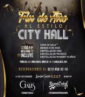 mensales, trae cena de gala para cada uno de los miembros, dls bo tellas de vino, dos botellas de pro seco, dos botellas de whisky y el brindis con las tradicionales uvas. Esta gran noche de CITY HALL es tá organizada por Banquetes Ga les en compañía con Ricardo Da her Producciones.