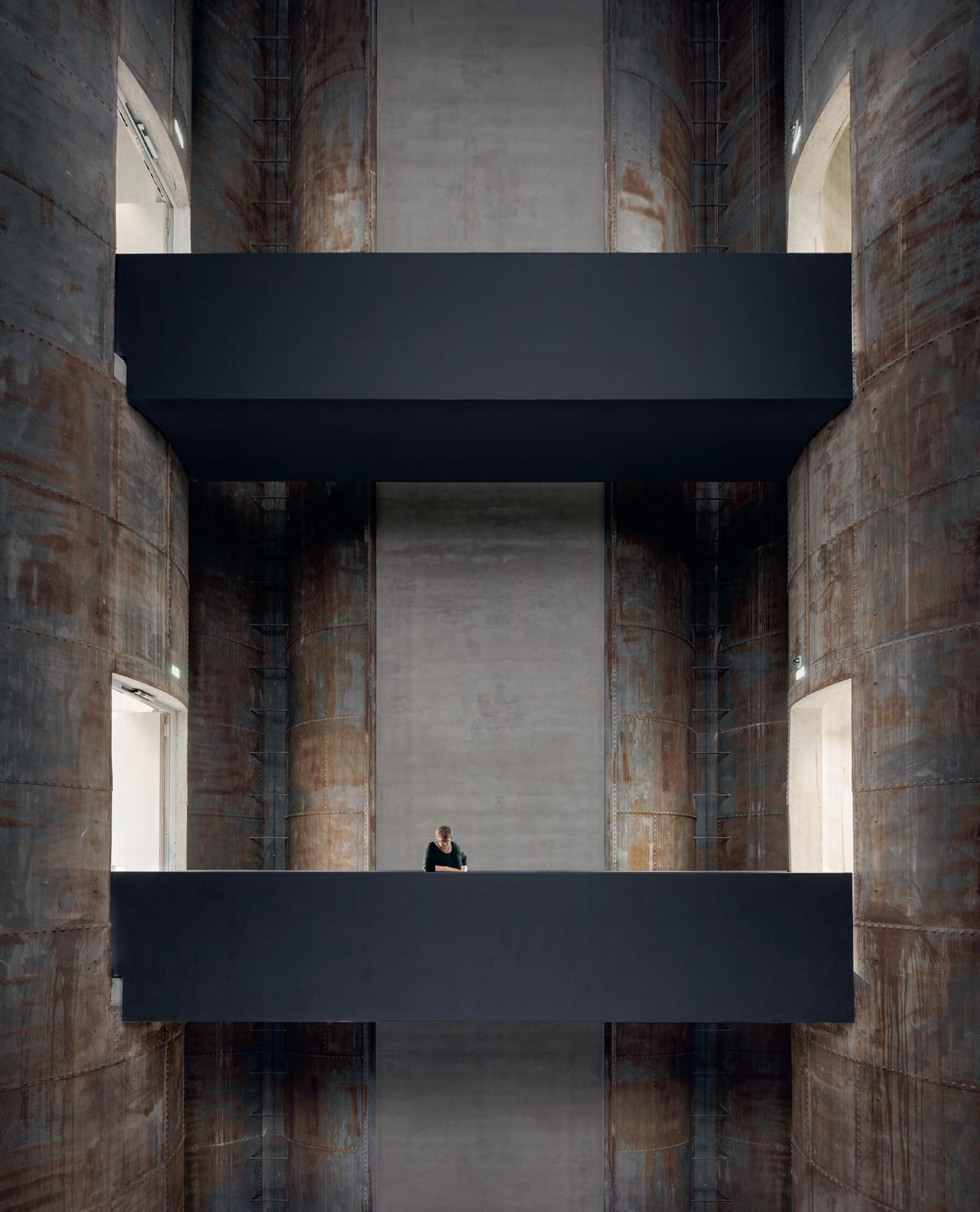 The original exhibition space expands to the new block through walkways that stretch across the void of the powerful concrete silos, forming an uninterrupted path through the museum’s art collections.